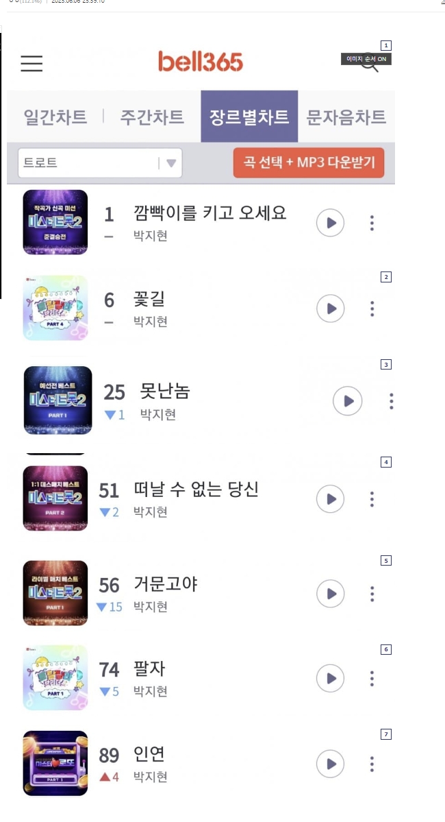 이외에도 6위 "꽃길' , 25위 '못난놈', 51위 '떠날 수 없는 당신', 56위'거문고야' 74위 '팔자', 89위 '인연'입니다