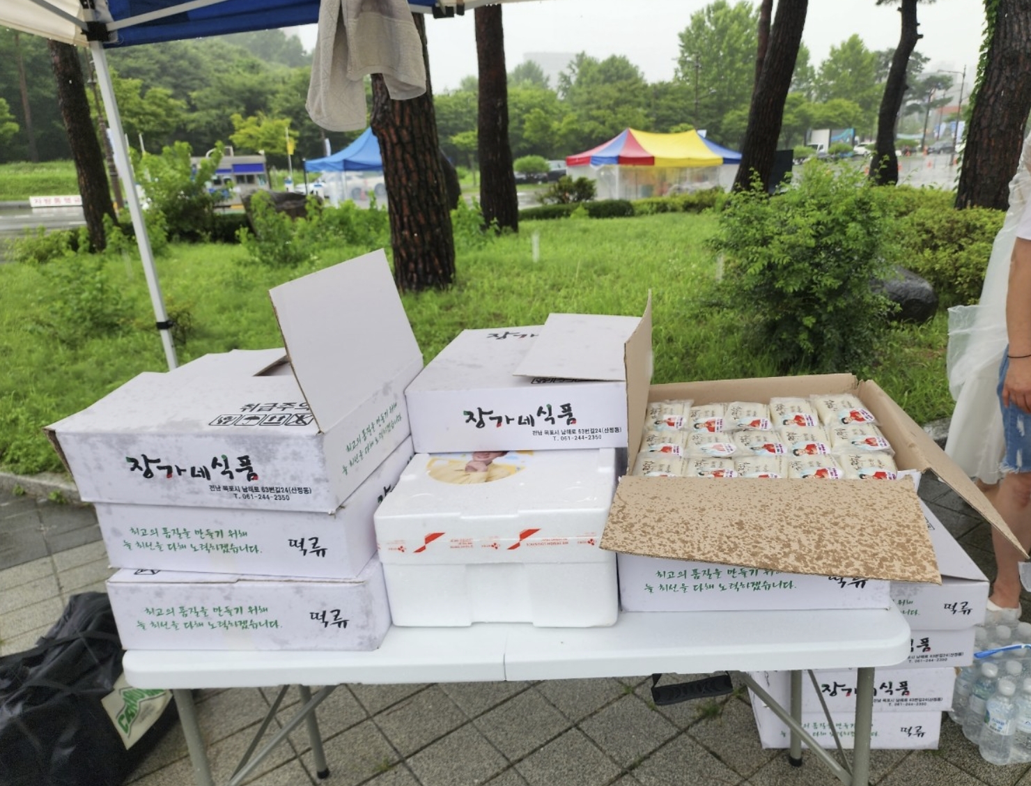 박지현의 어머님께서 팬분들을 위해 떡이랑 음료를 준비해 오셨습니다