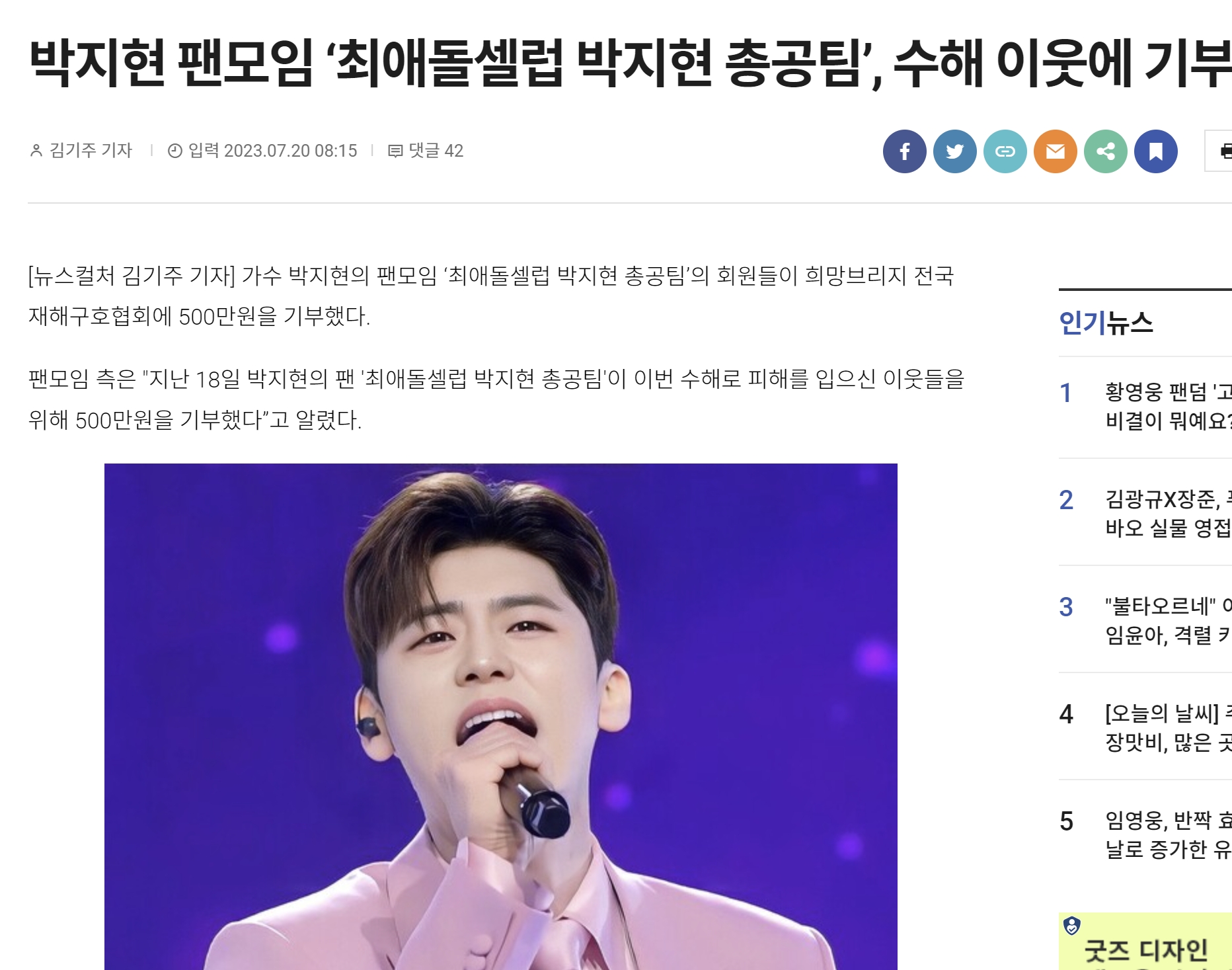 박지현의 팬모임인 <최애돌셀럽 박지현 총공팀>이 수해 이웃을 위해 희망 브리지 전국 재해구호협회에 500만원을 기부했습니다