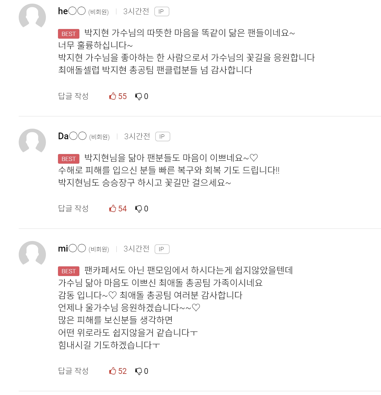 박지현 총공팀 관계자는 이번 수해를 입으신 분들께 조금의 위로가 되길 바란다며 앞으로도 가수 박지현에게 좋은 영향을 주는 든든한 팬들이 되겠다며 소감을 밝혔습니다