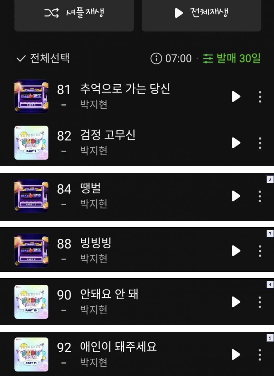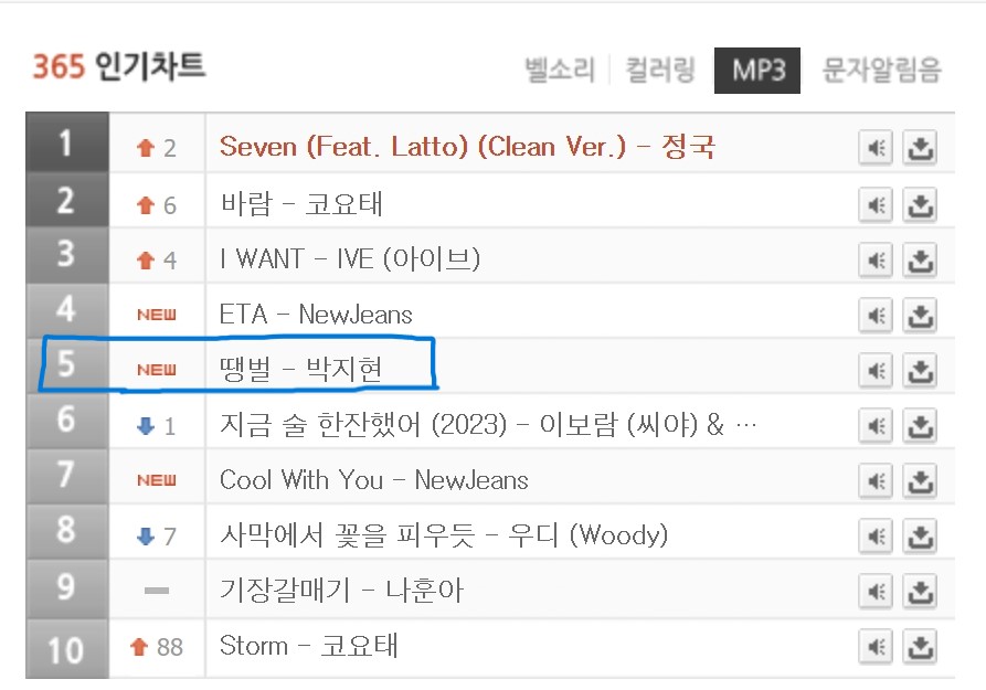 벨365 인기차트 MP3 7월22일 오후1시 기준 5위 박지현 '땡벌' 입니다
