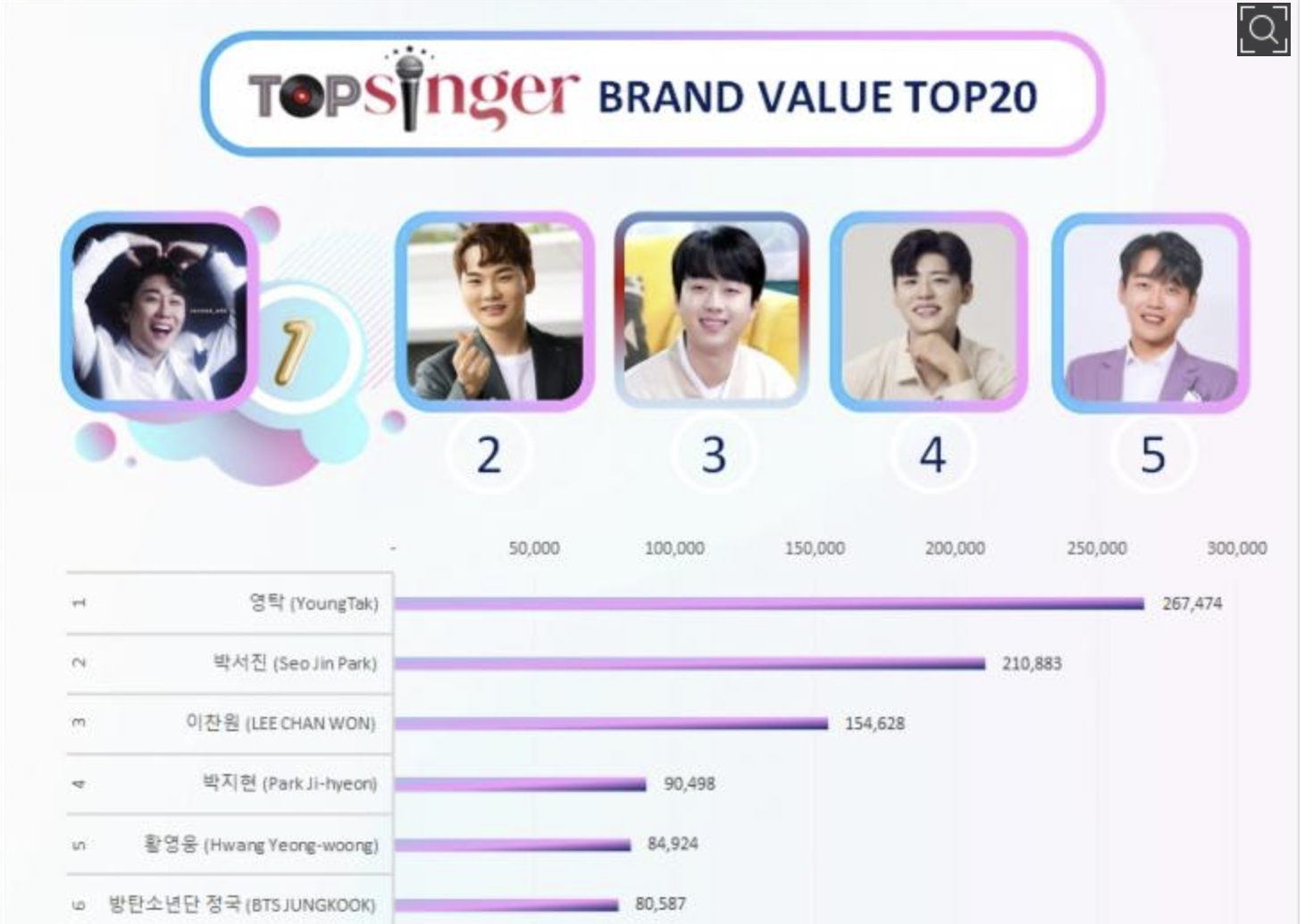 박지현은 6건 보도, 열독률 점, 독자추천 4,963점, 기사댓글 272점, 스타 서베이 85,263점을 얻어 도합 90,498점으로 4위에 올랐습니다