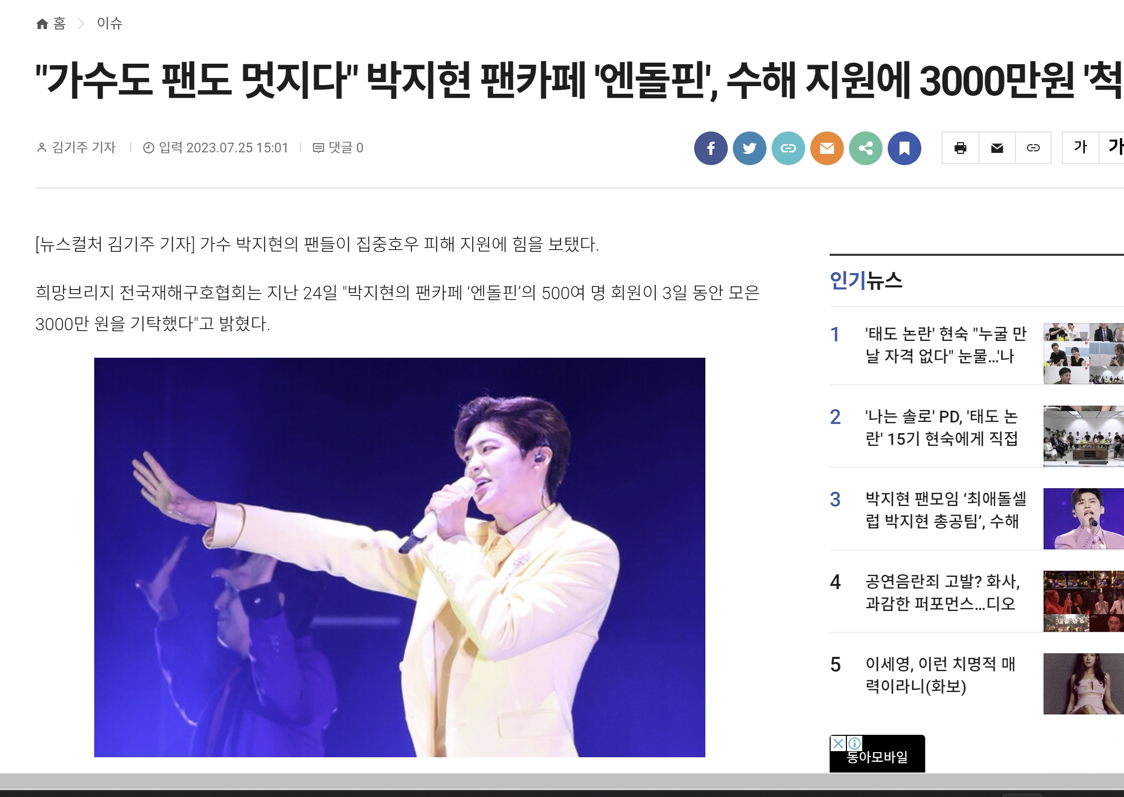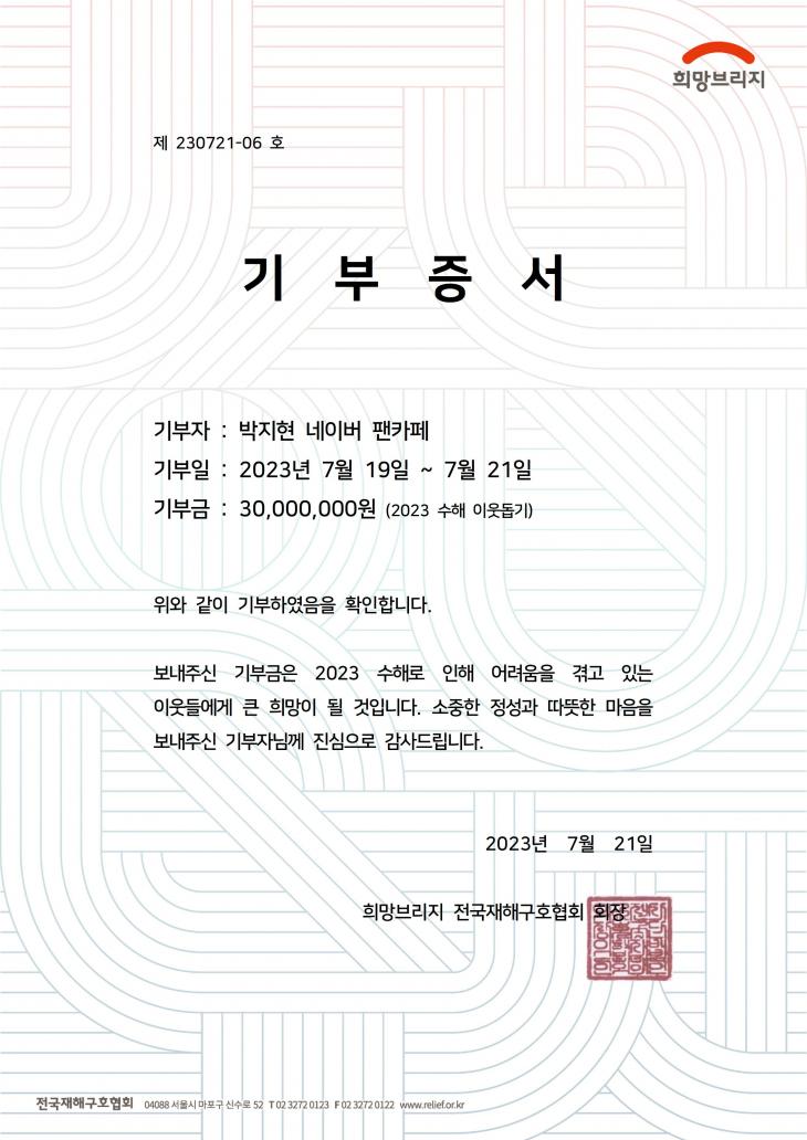 희망브리지 전국 재해구호협회는 가수 박지현의 팬들이 수해 이웃을 위해 3천만원을 기부했다고 밝혔습니다
