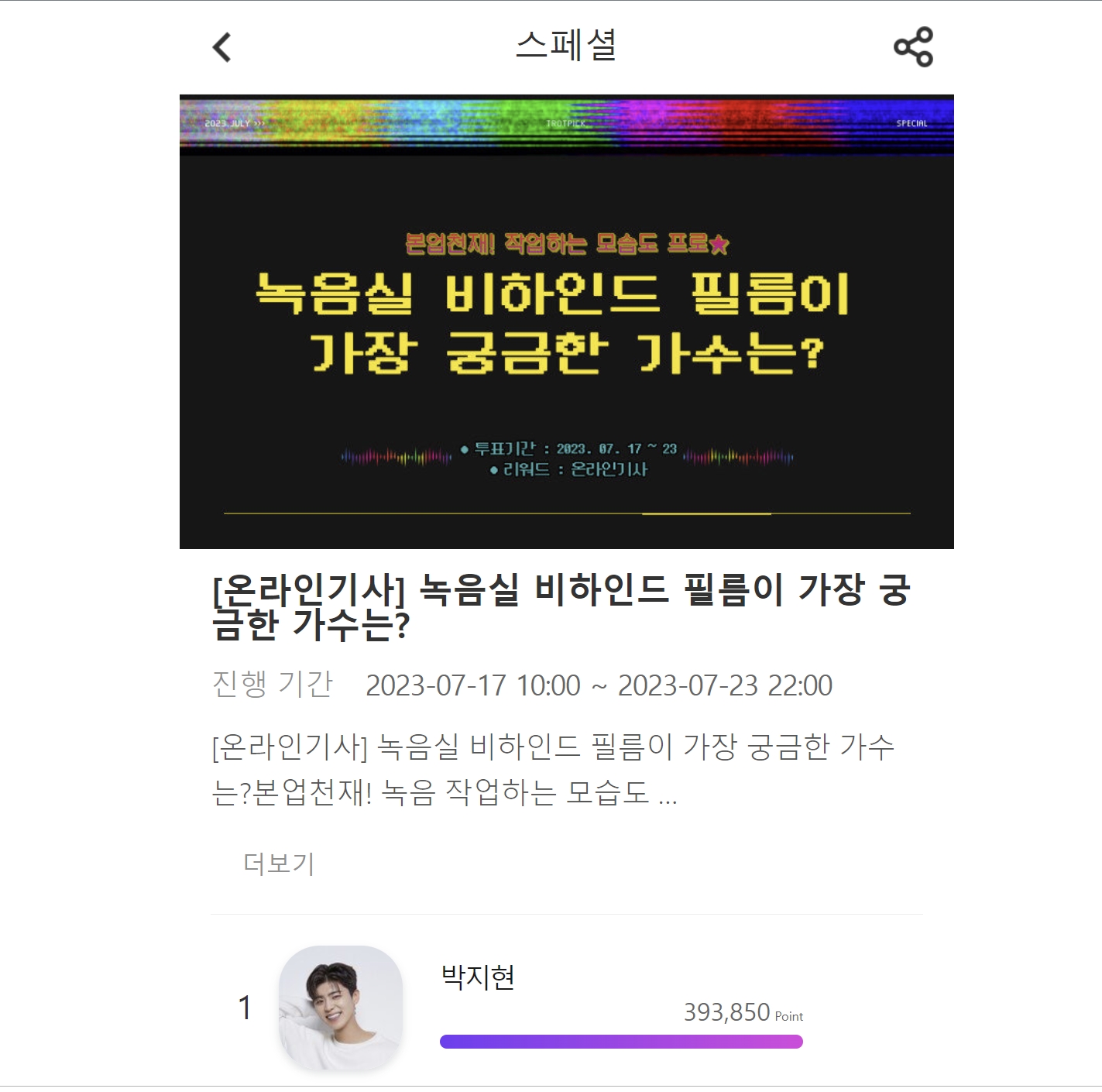 7월24일 트롯스타 투표 웹서비스 '트롯픽'에 따르면 박지현은 '본업천재 , 작업하는 모습도 프로!녹음실 비하인드 필름이 가장 궁금한 가수는?이라는 주제로한 7월3주차 스페셜 투표에서 39만3850포인트를 획득해 1위를 차지했습니다