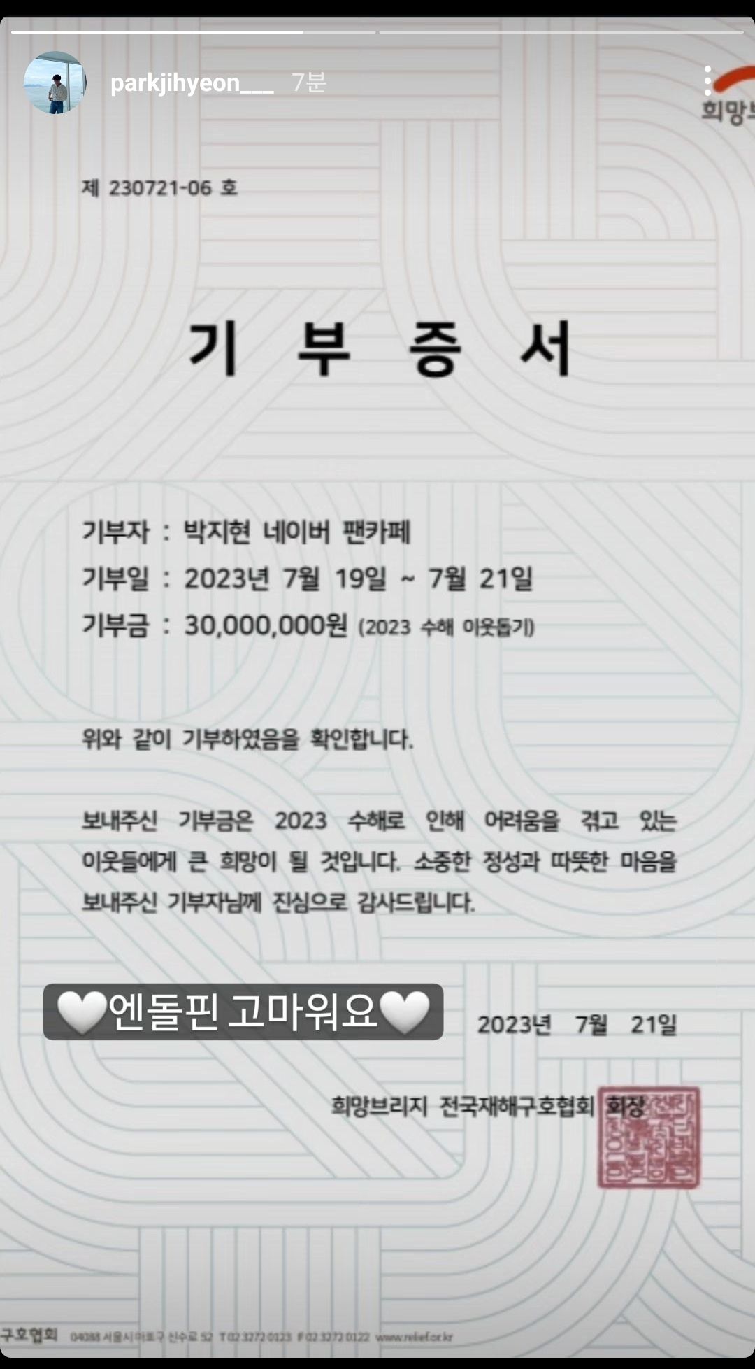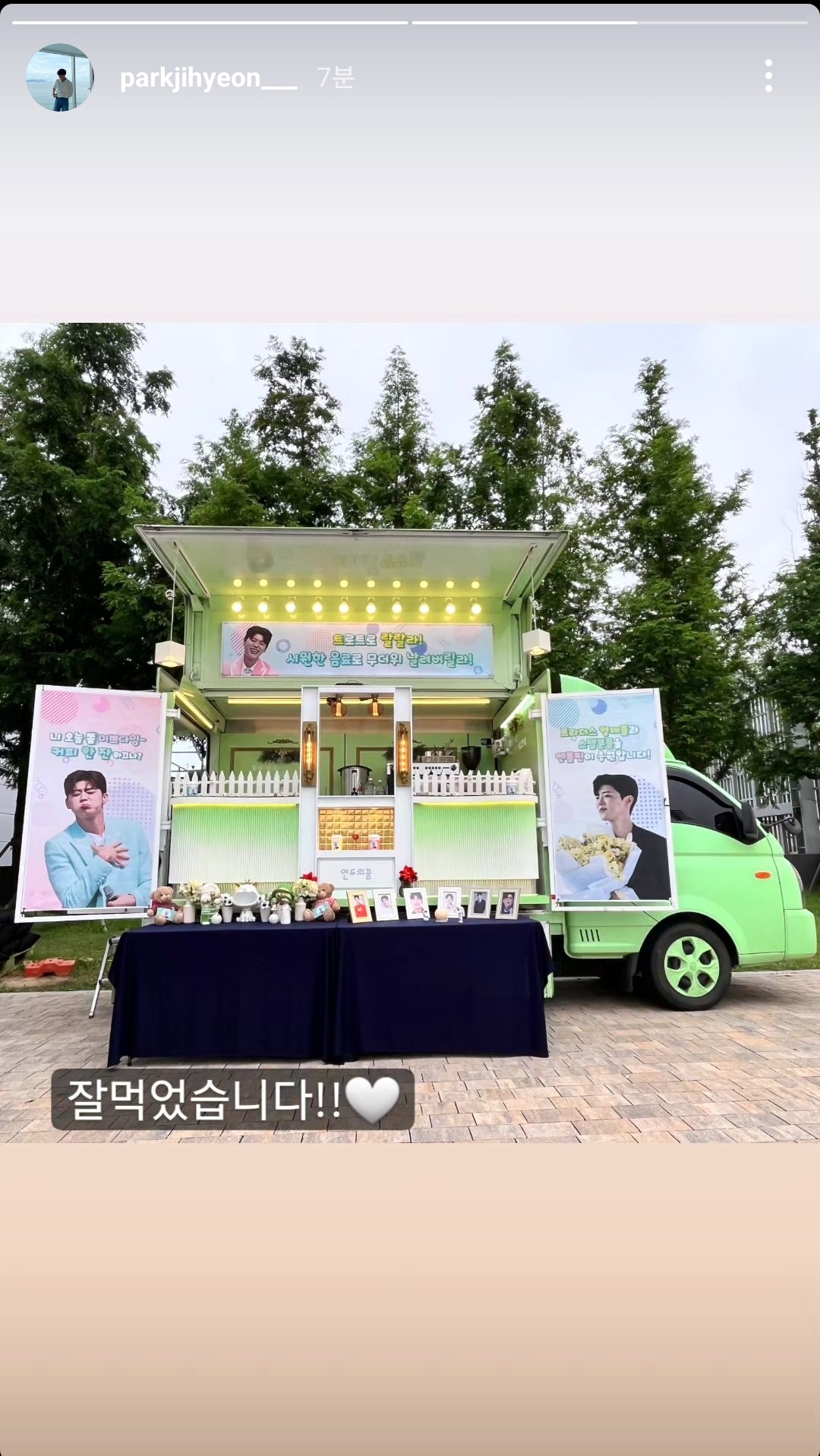 엔돌핀분들이 기부하신 것에 대해 너무 감사한다는 감사인사와 커피차 인증샷과 함께 다같이 감사히 잘 먹었다고 전했습니다