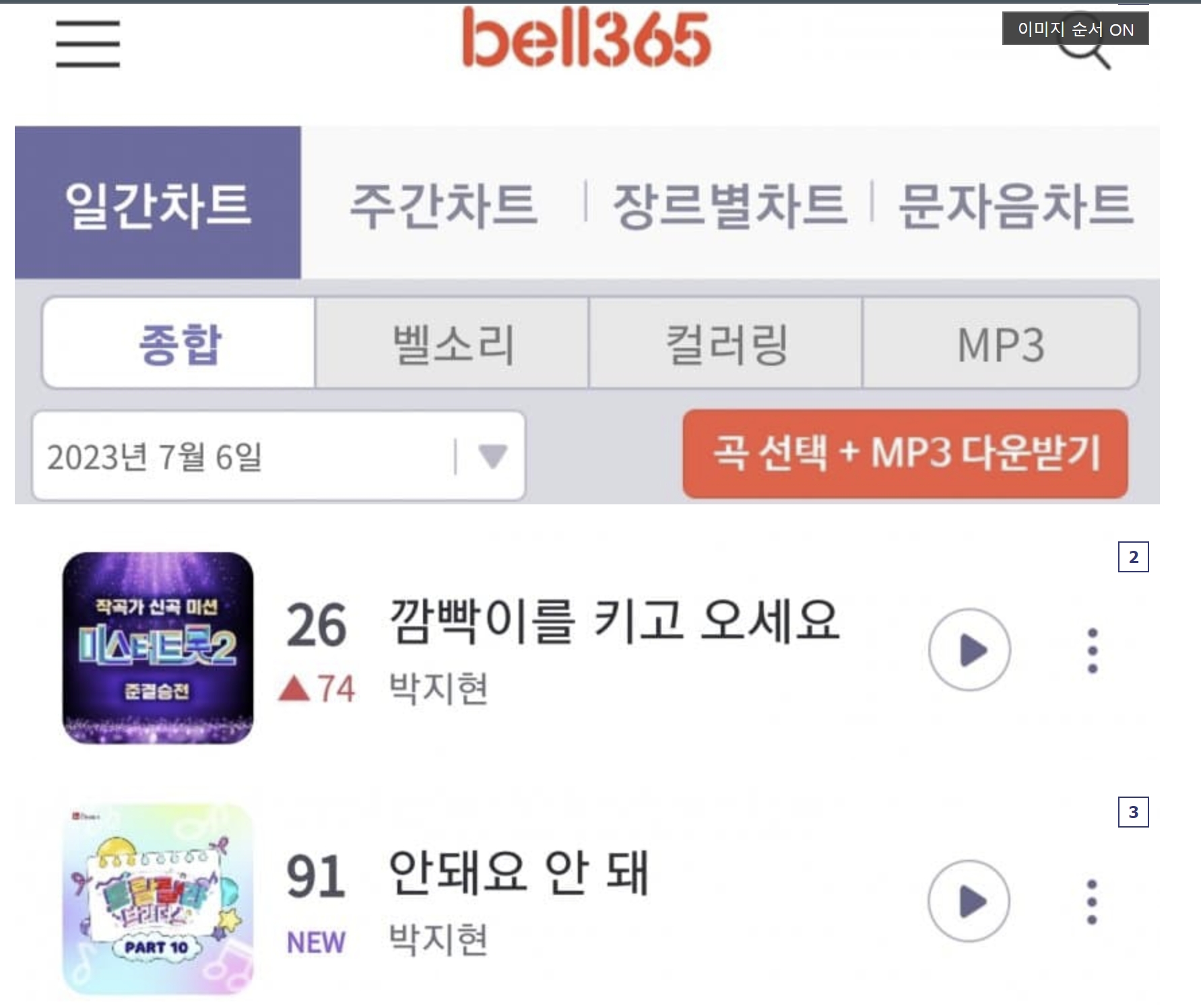 7월6일자 벨소리 365차트 일간차트에 5일 트랄랄라 브라더스에서 부른 '안돼요 안돼'가 91위로 진입했습니다