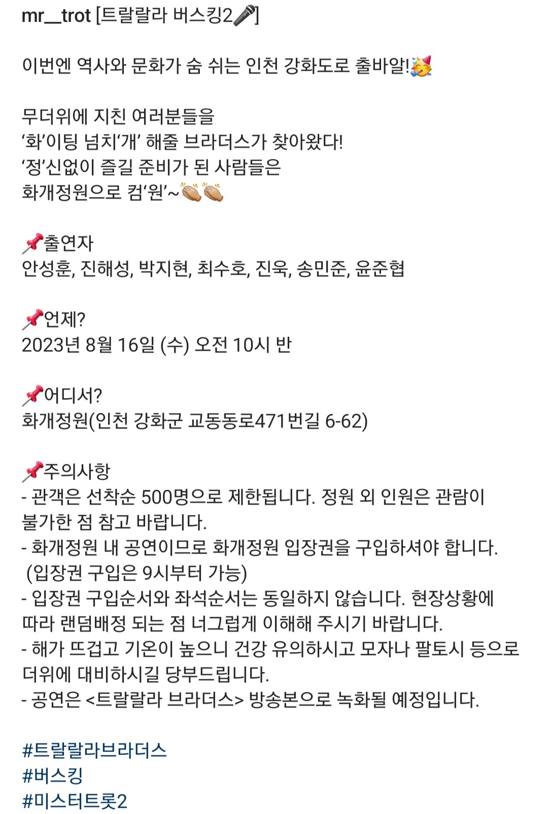 트롯 브로들이 펼치는 멋진 버스킹의 무대를 볼 수있는 이번 트랄랄라 버스킹은 선착순500명으로 제한된다고 합니다