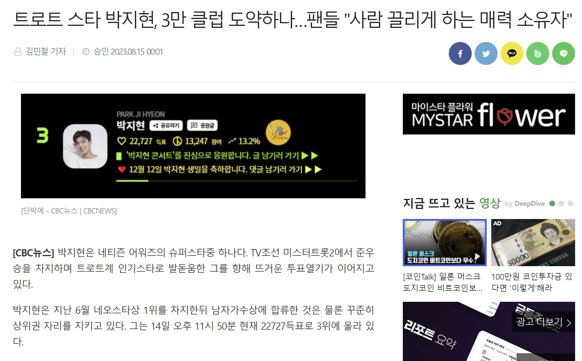 또 박지현이 네티즌 어워즈 남자가수상 부문 3만 클럽 코앞이며 사람 끌리게 하는 매력 소유자란 기사도 게재되었습니다