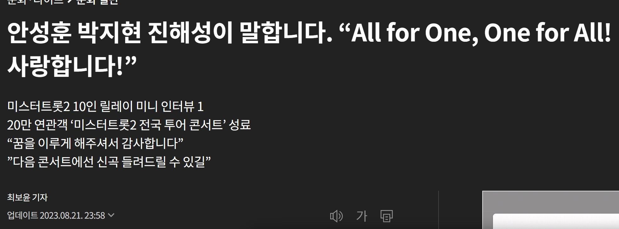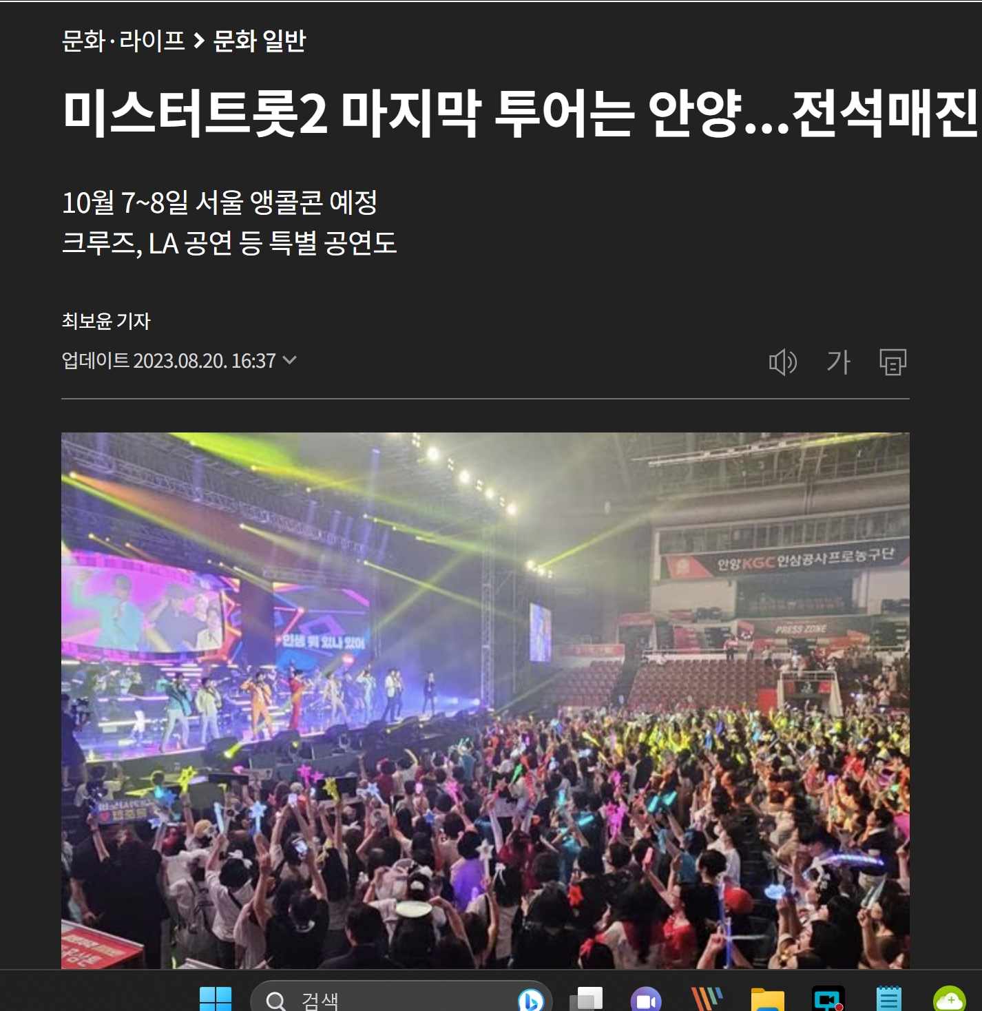 10월7일과 8일 서울 경희대학교 평화의 전당에서 미스터트롯2 전국투어 앙코르 콘서트를 개최한다고 기사가 게재되었습니다