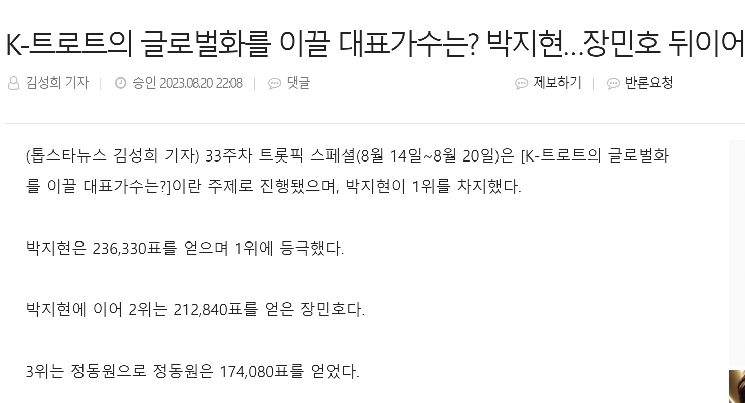33주차 트롯픽 스페셜(8월 14일~8월 20일)에서 'K-트로트의 글로벌화를 이끌 대표가수는? 투표에서 박지현이 1위를 차지했습니다