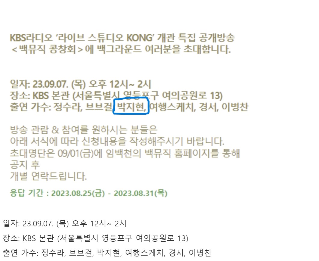 방청을 원하시는 분은 서식에 따라 신청내용을 작성해야 하며 초대명단은 9월1일 금요일에 백뮤직 홈페이지를 통해 발표후 게별 연락 드린다고 합니다