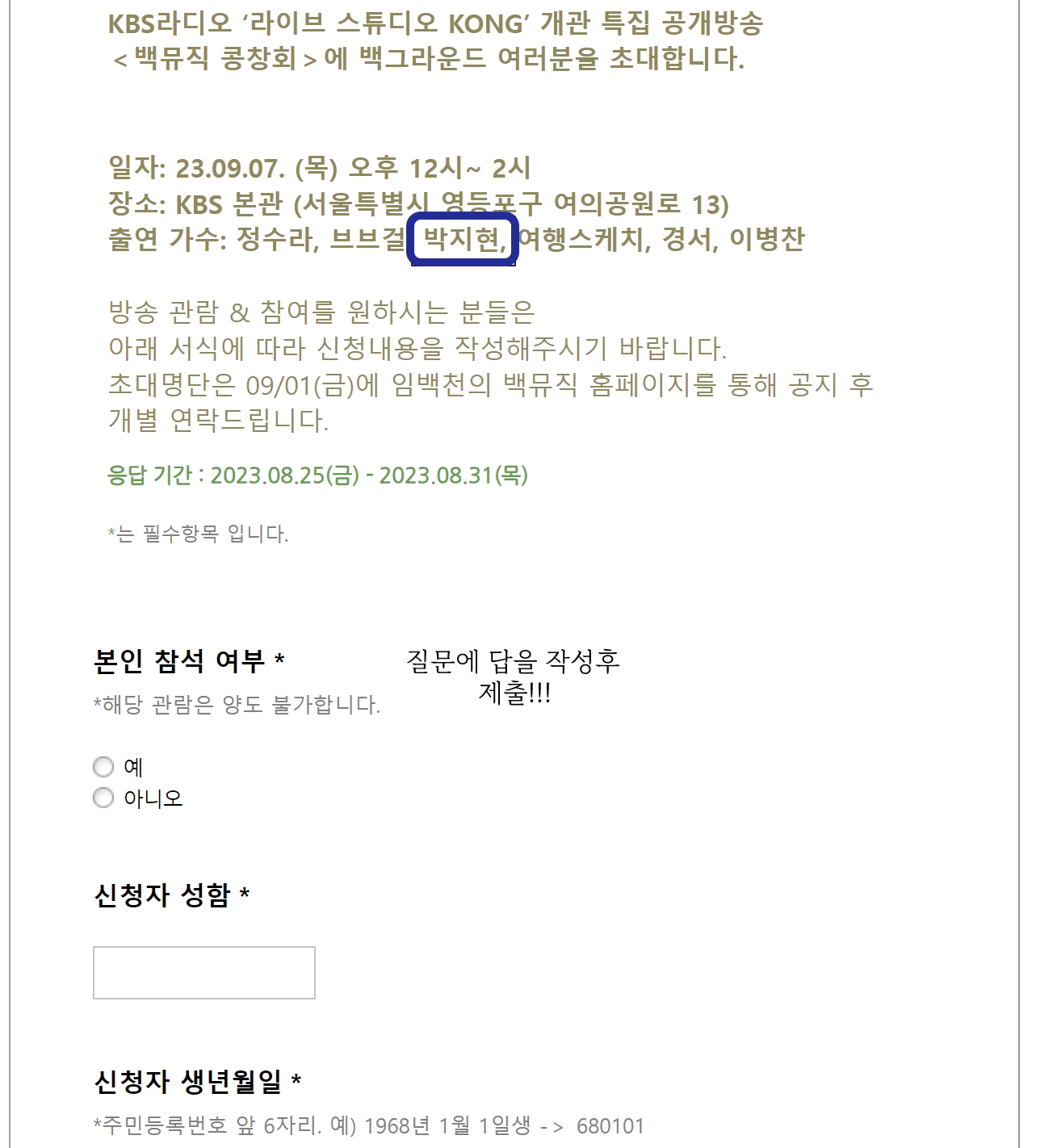 방청을 원하시는 분은 서식에 따라 신청내용을 작성해야 하며 초대명단은 9월1일 금요일에 백뮤직 홈페이지를 통해 발표후 게별 연락 드린다고 합니다