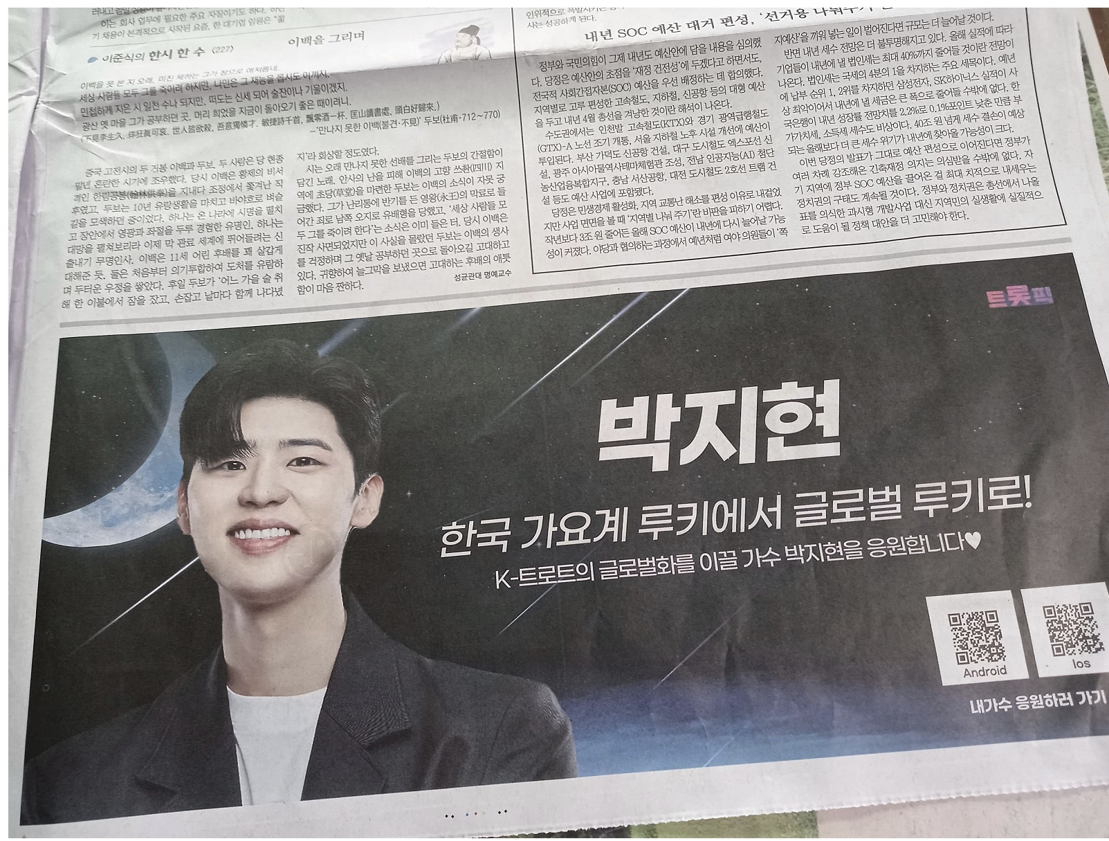 트롯픽에서 1위를 기록하면 동아일보에 스타의 홍보가 게재되는데요!