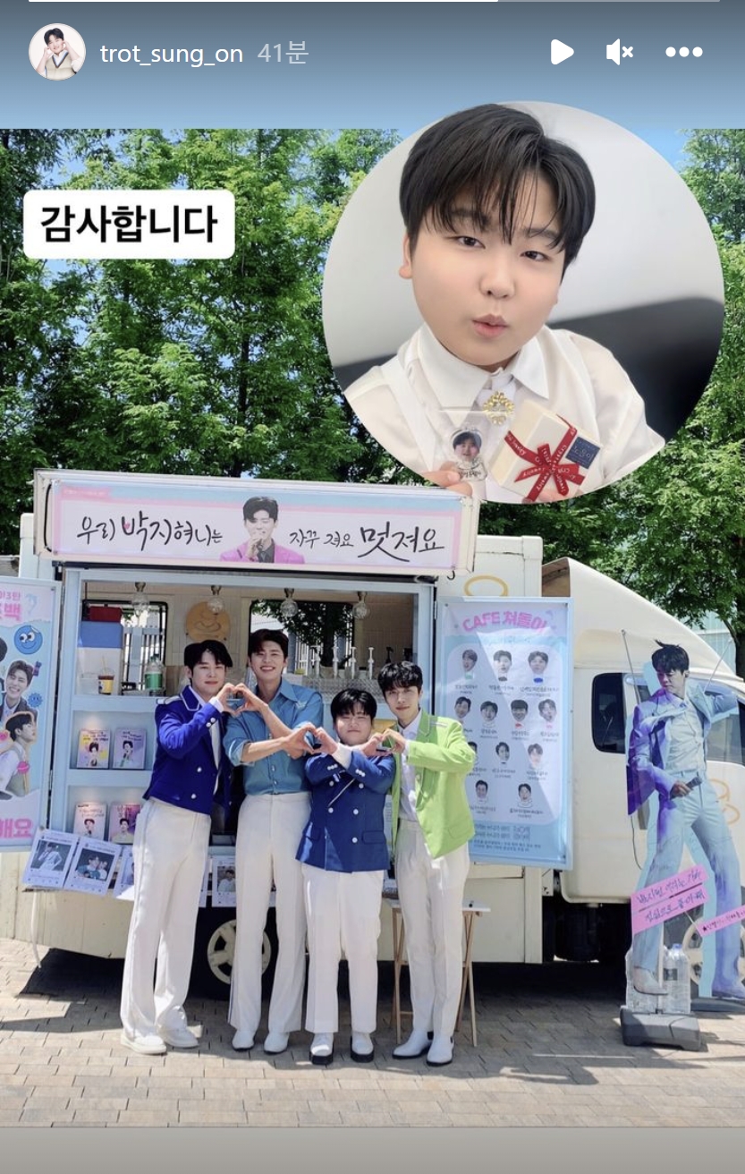 커피차에 예쁜 키링까지 준비해서 더운 여름 박지현과 트롯형제들이 시원하고 기분좋게 촬영할 것 같습니다!