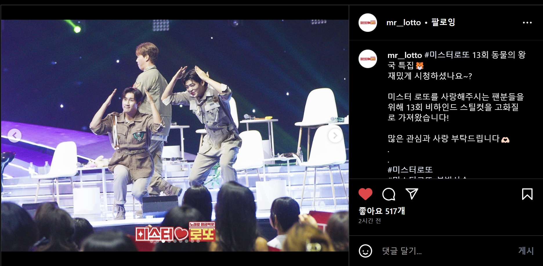 미스터 로또에서 동물의 왕국특집 비하인드 스틸컷 사진을 공개했습니다