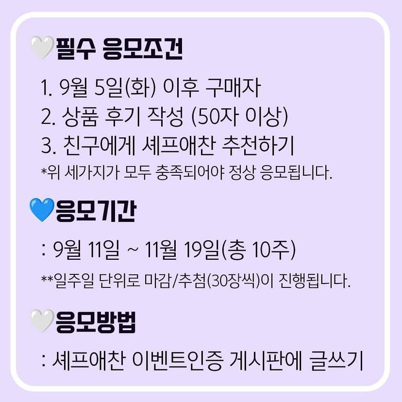 응모조건은 9월5일 화요일 이후 구매자이며 상품후기를 50자 이상 작성하시고 친구에게 셰프애찬을 추천하기를 해야 정상 응모 됩니다 추첨은 차주 금요일 오후2시 유튜브 세프애찬 채널에서 생중계로 진행된다고 전했습니다