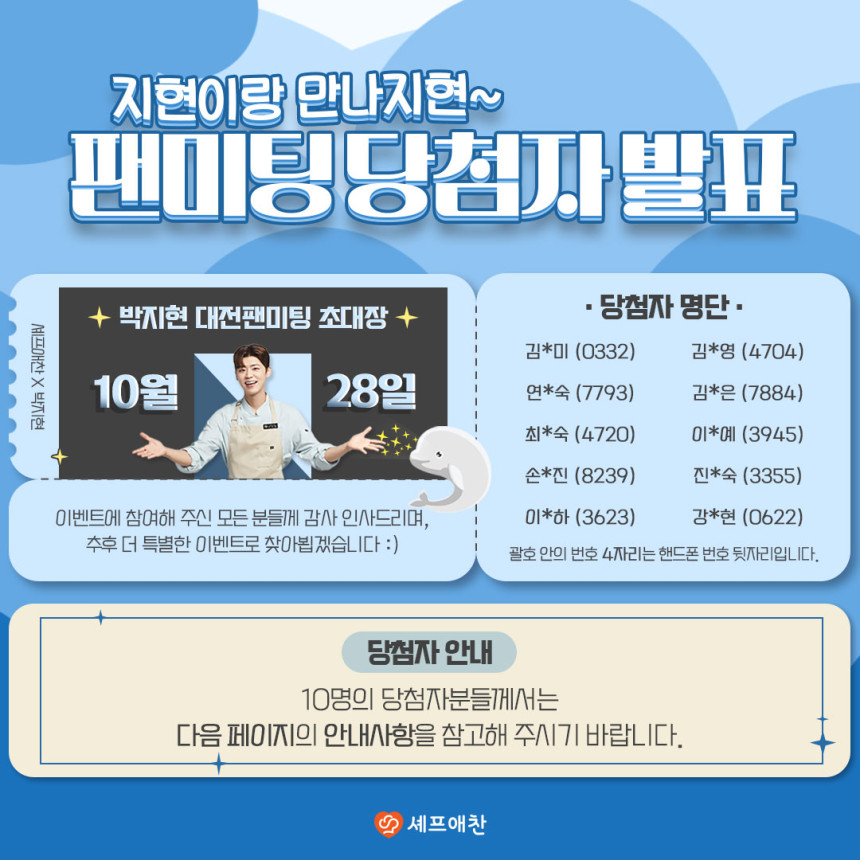 라이브방송은 2023년 9월15일 토요일이며 당첨자 명단은 셰프애찬 공식 홈페이지 공지사항 게시글이나 인스타그램 피드를 통해 확인 하실 수 있습니다