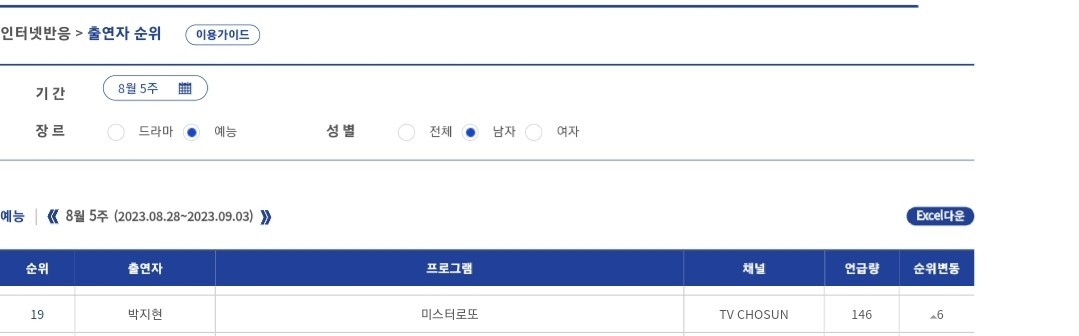 방송통신위원회에서 주관하는 방송콘텐츠 가치정보 분석시스템 라코이 8월5주 예능 부문 남자 부문에 미스터 로또의 박지현이 19위를 차지했습니다