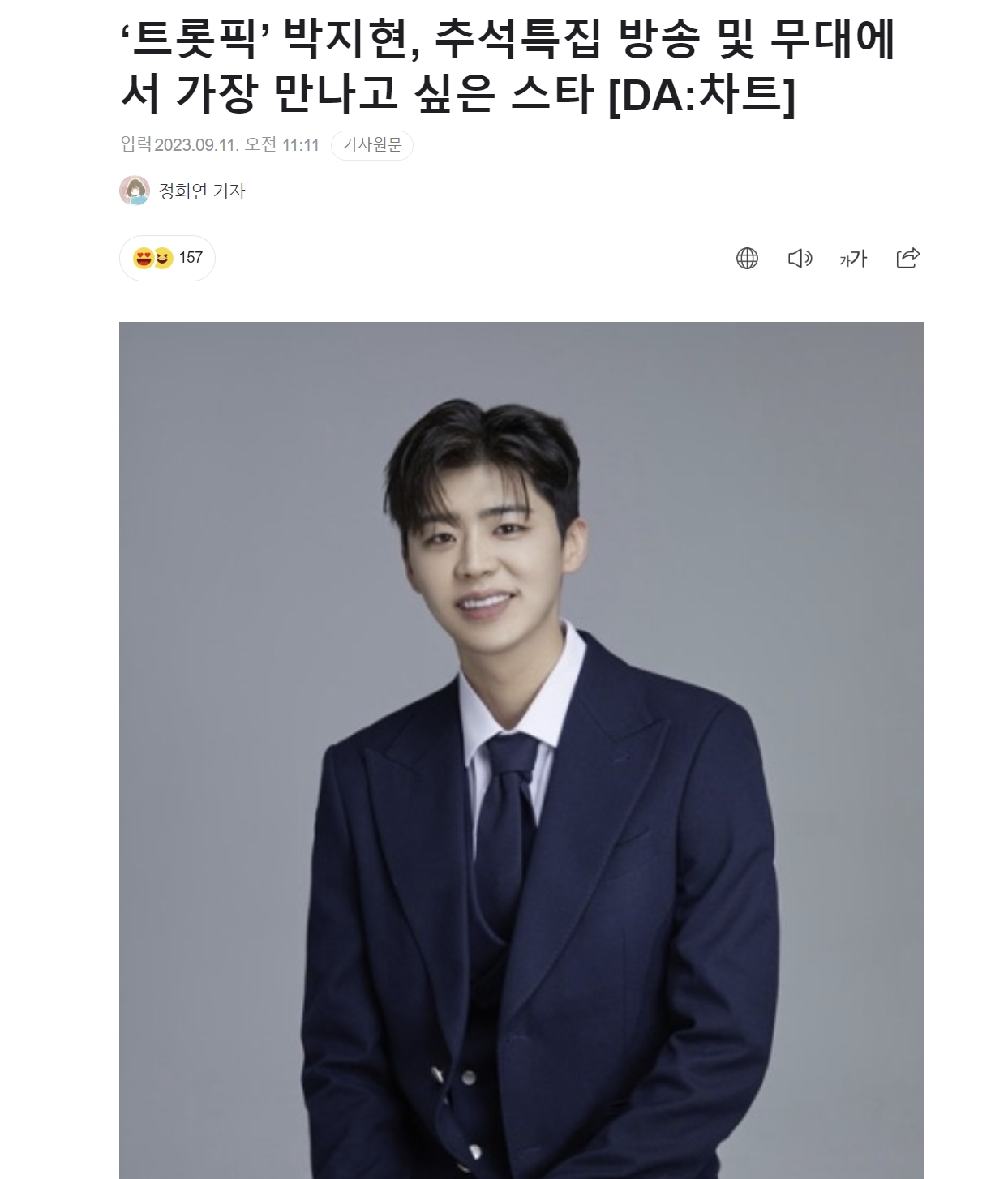 '트롯픽'은 4일부터 10일까지 진행된 스페셜 투표 '추석특집 방송 및 무대에서 가장 만나고 싶은 스타는?'결과 박지현이 31만 1380포인트를 기록하며 1위를 차지했다고 전했습니다