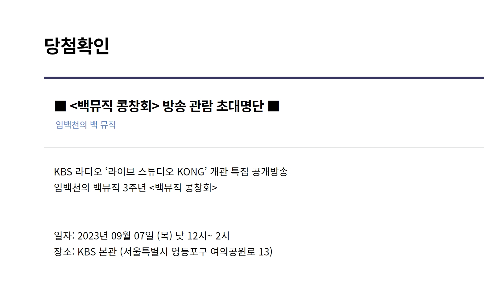 임백천의 백뮤직 3주년<백뮤직 콩창회> 방송 관람 초대권 담청자가 발표되었습니다