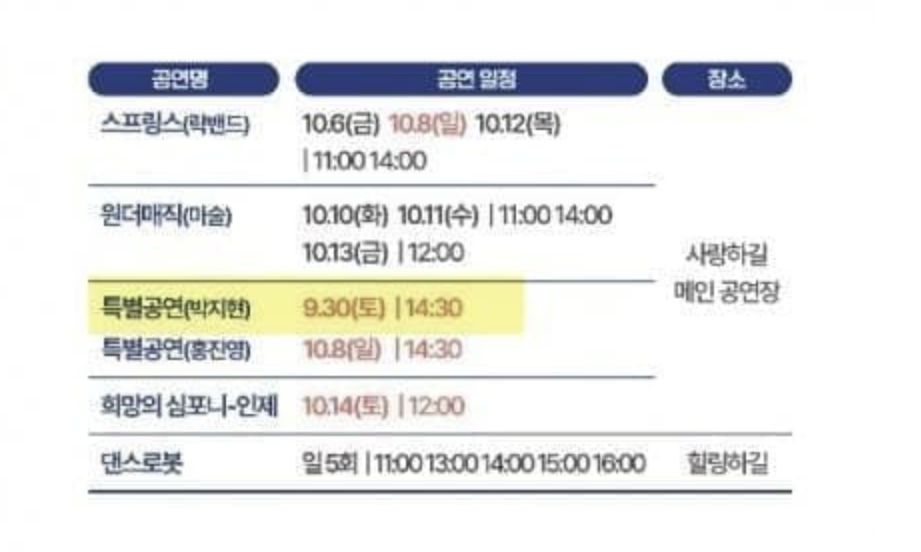 박지현은 9월30일 오후 2시30분에 특별공연이 예정돼있습니다