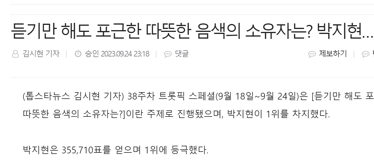 38주차 트롯픽 스페셜(9월18~9월24일)에서 '듣기만 해도 포근한 따뜻한 음색의 소유자는?이란 주제로 진행된 투표에서 박지현이 355,710표를 얻으며 1위를 차지했다고 밝혔습니다