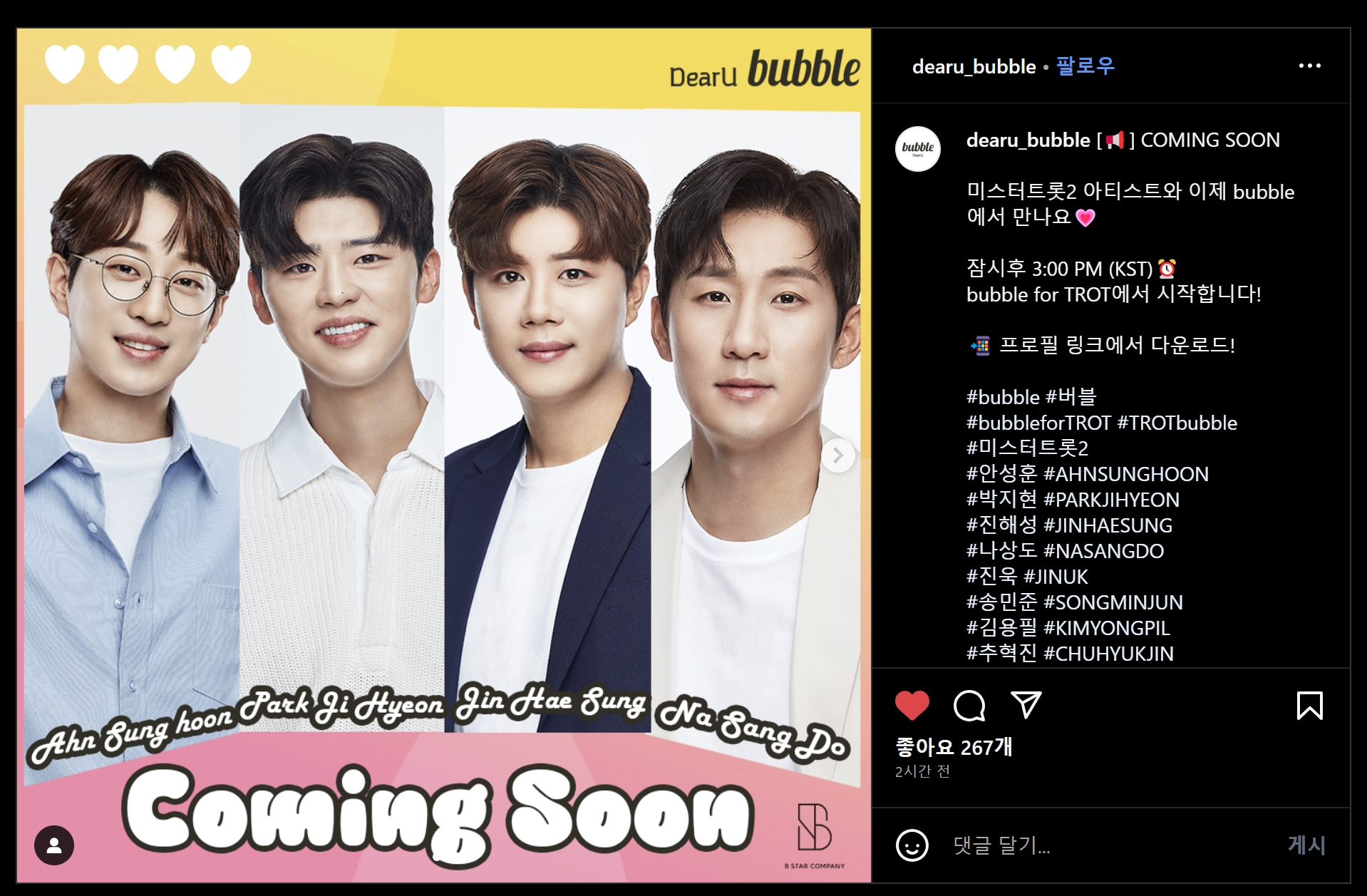 26일 오후 3시부터 '버블'앱에서 bubble for TROT를 출시한다고 밝혔습니다