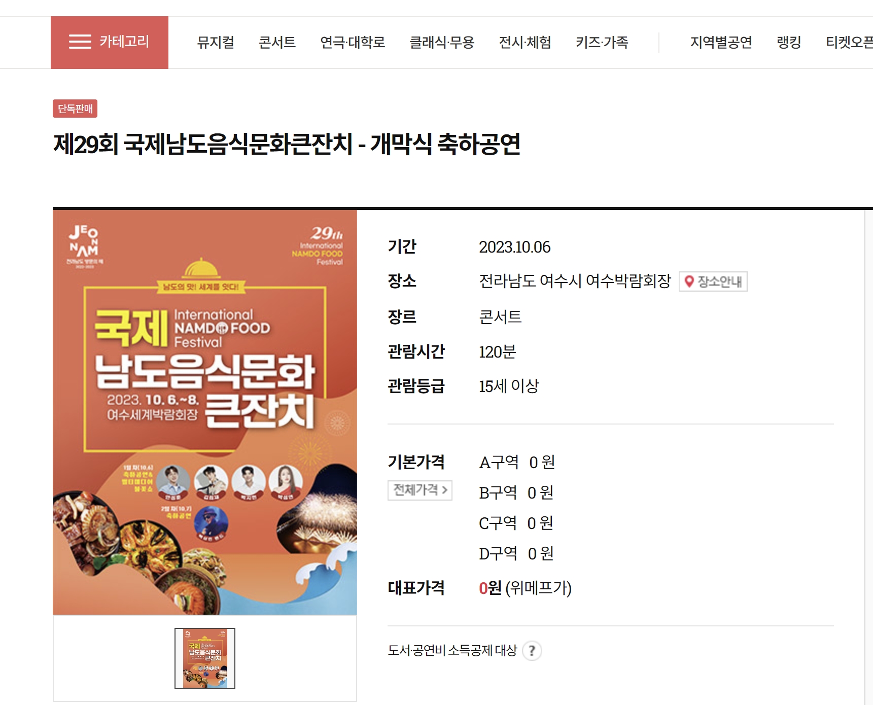 26일 화요일 오후 2시부터 국제 음식 문화 큰잔치 무료 공연 티켓팅이 진행되고 있습니다