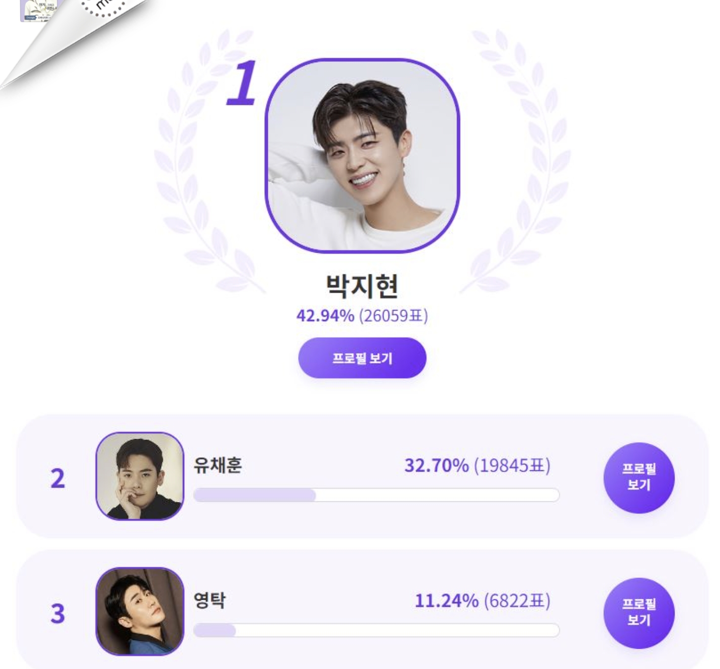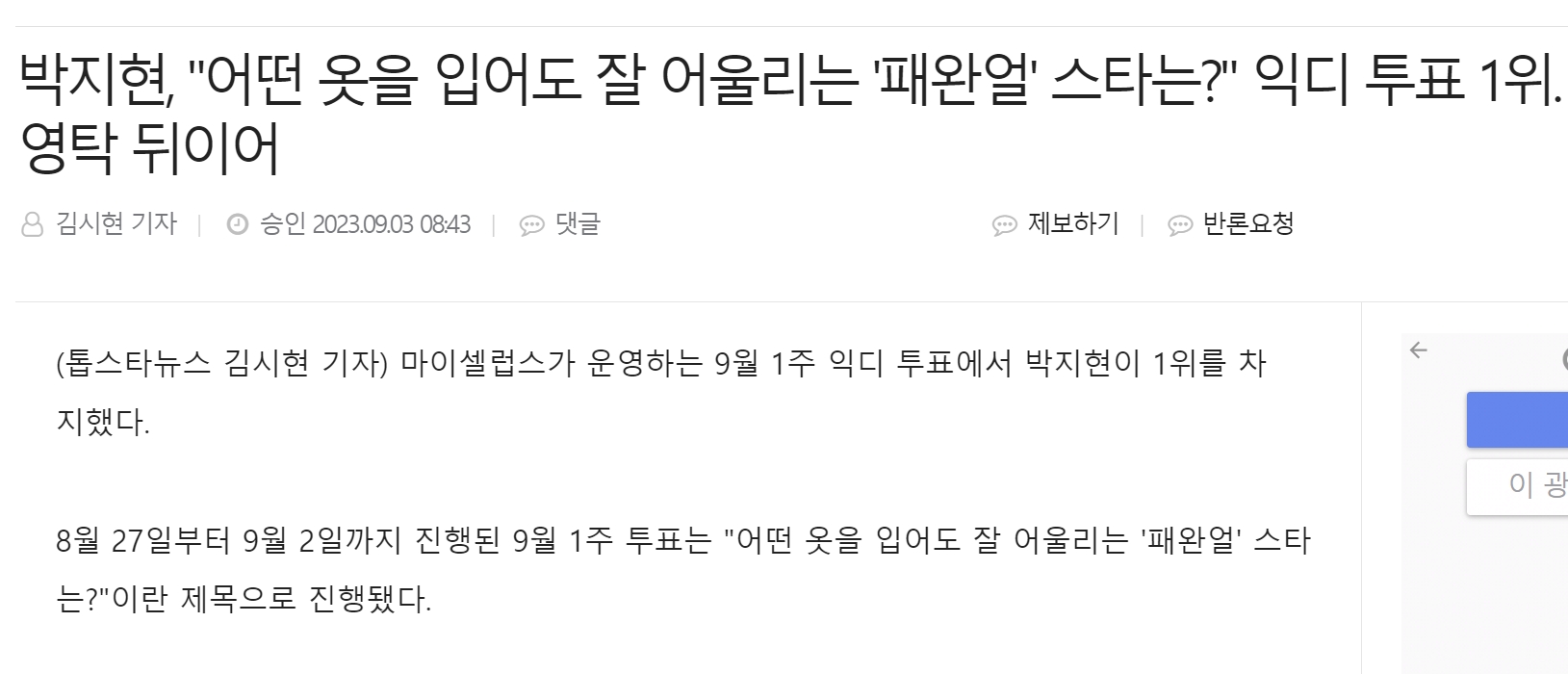 마이셀럽스가 운영하는 9월1주 익디 투표 "어떤 옷을 입어도 잘 어울리는 '패완얼'스타는?투표에서 박지현이 1위를 차지했습니다