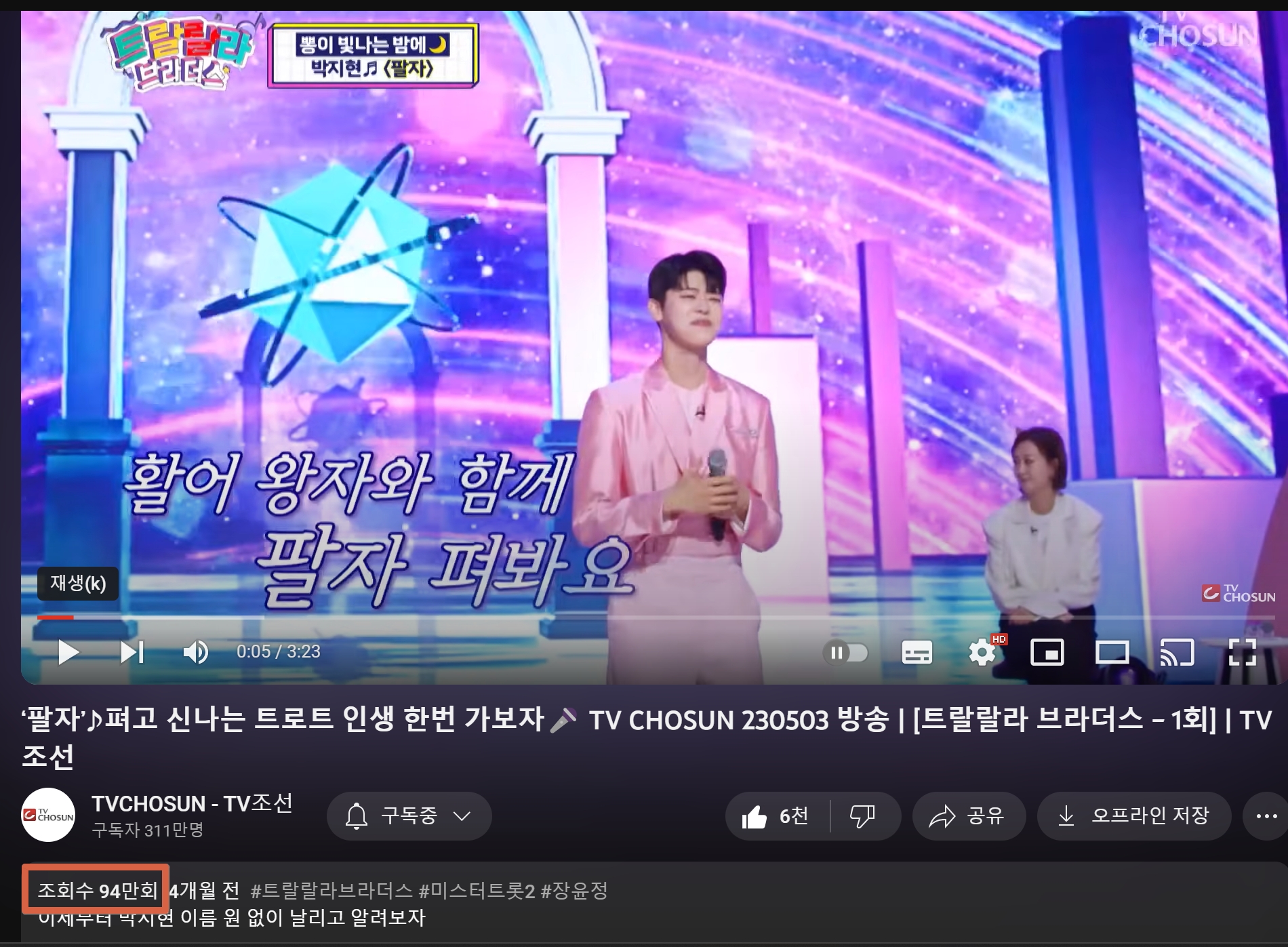 9월4일 오전11시 기준 박지현의 '팔자'영상은 94만뷰를 기록하고 있습니다 경연에서 부른 곡들은 이미 백만뷰를 넘은 곡들이 많지만 예능에서 부른 음악이 백만뷰를 넘는 것은 최초이므로 의미가 큰 것 같습니다!