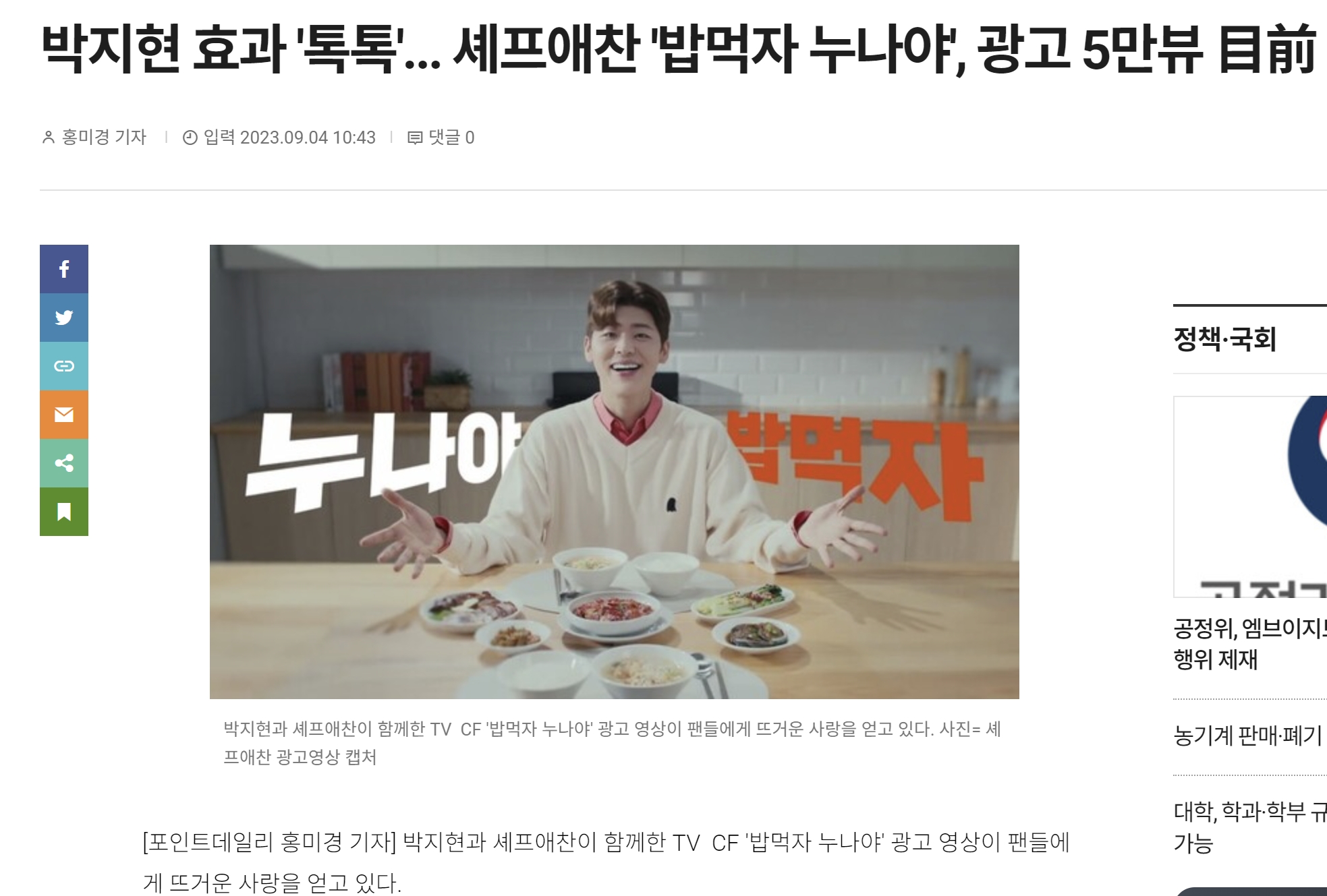 9월4일자 기사에 '박지현 효과 톡톡- 셰프애찬'밥먹자 누나야'광고 5만뷰 목전이라는 기사가 게재됐습니다