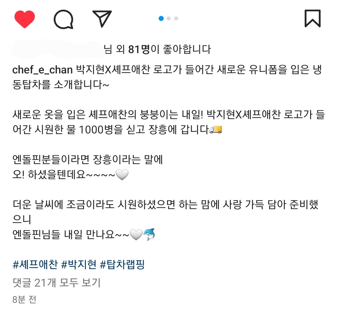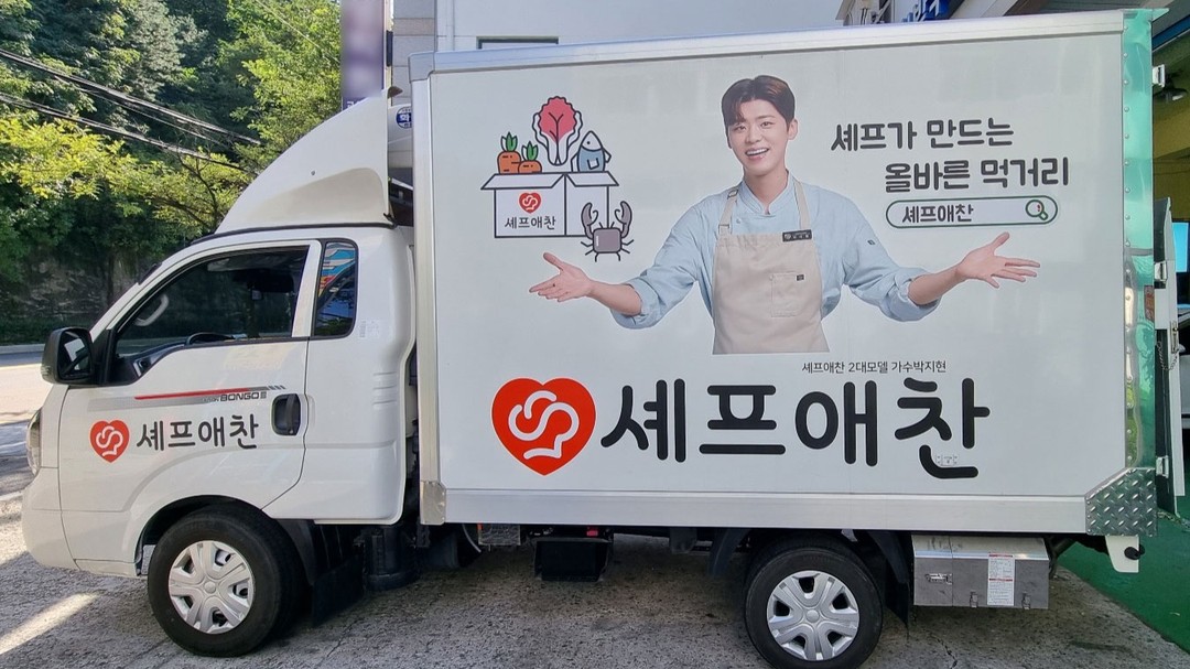 또 셰프애찬에서 박지현과 셰프애찬 로고가 들어간 새로운 유니폼을 입은 냉동탑차가 9월8일 시원한 물 1000