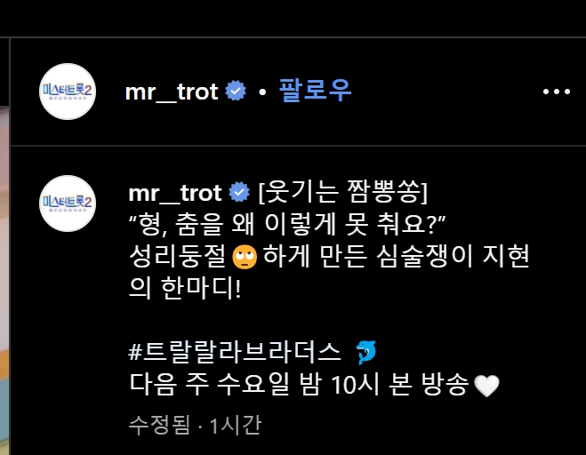 미스터 트롯 인스타 계정에 트랄랄라 브라더스의 박지현님 사진을 올려주셨습니다!