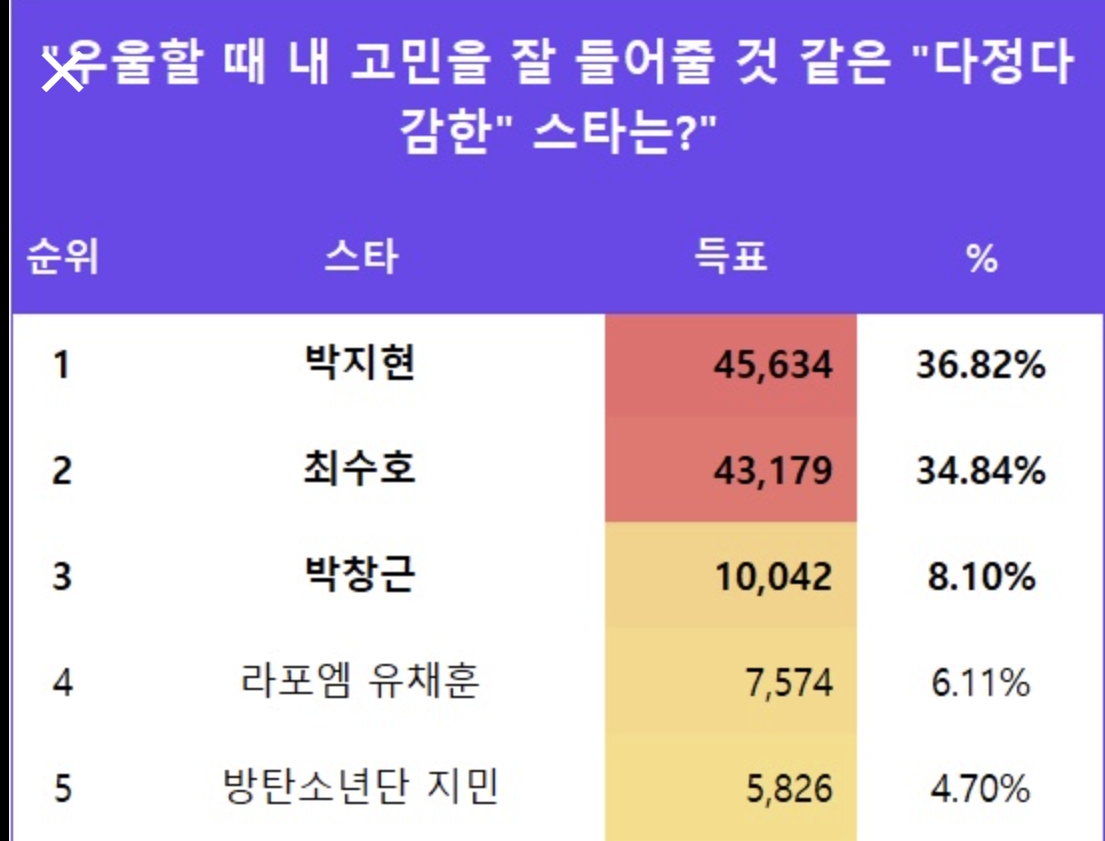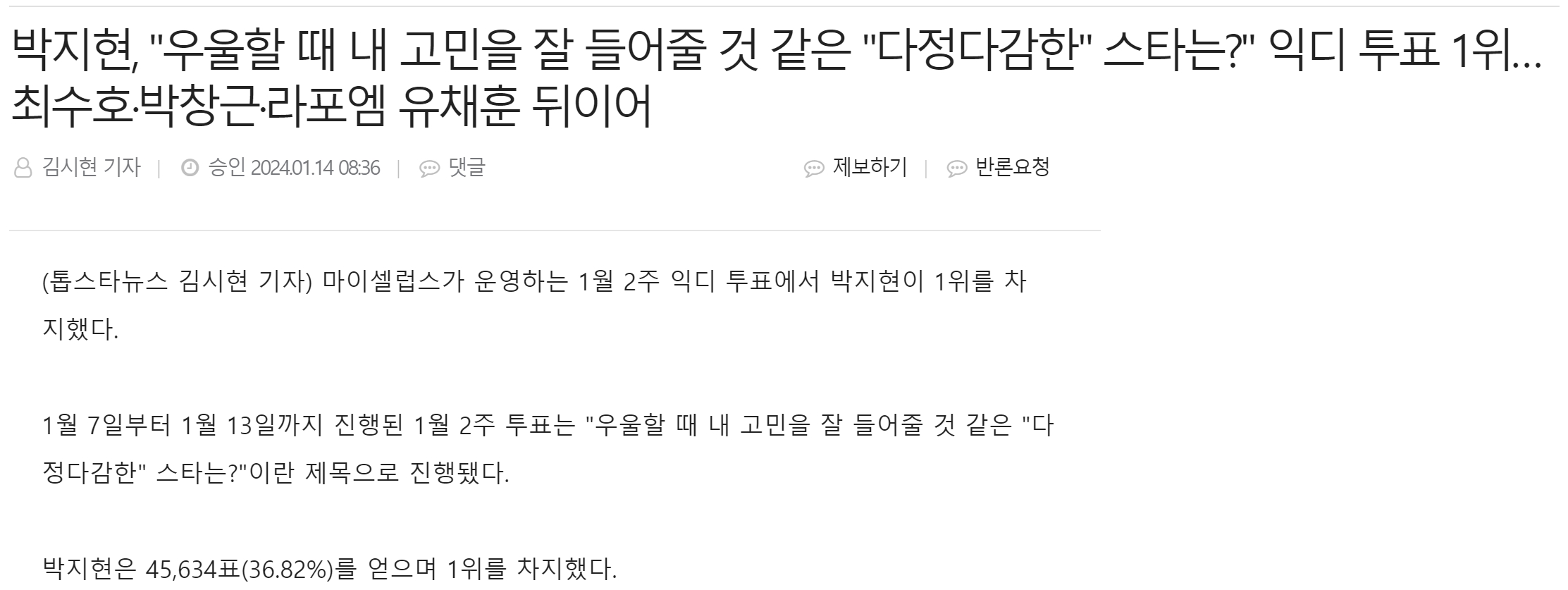 박지현님이 마이셀럽스가 운영하는 1월 2주 익디 투표(1월7일부터 13일까지 진행) '우울할 때 내 고민을 잘 들어줄 것 같은 다정다감한 스타'에 45,634표(36.82%)를 얻으며 1위를 차지했습니다
