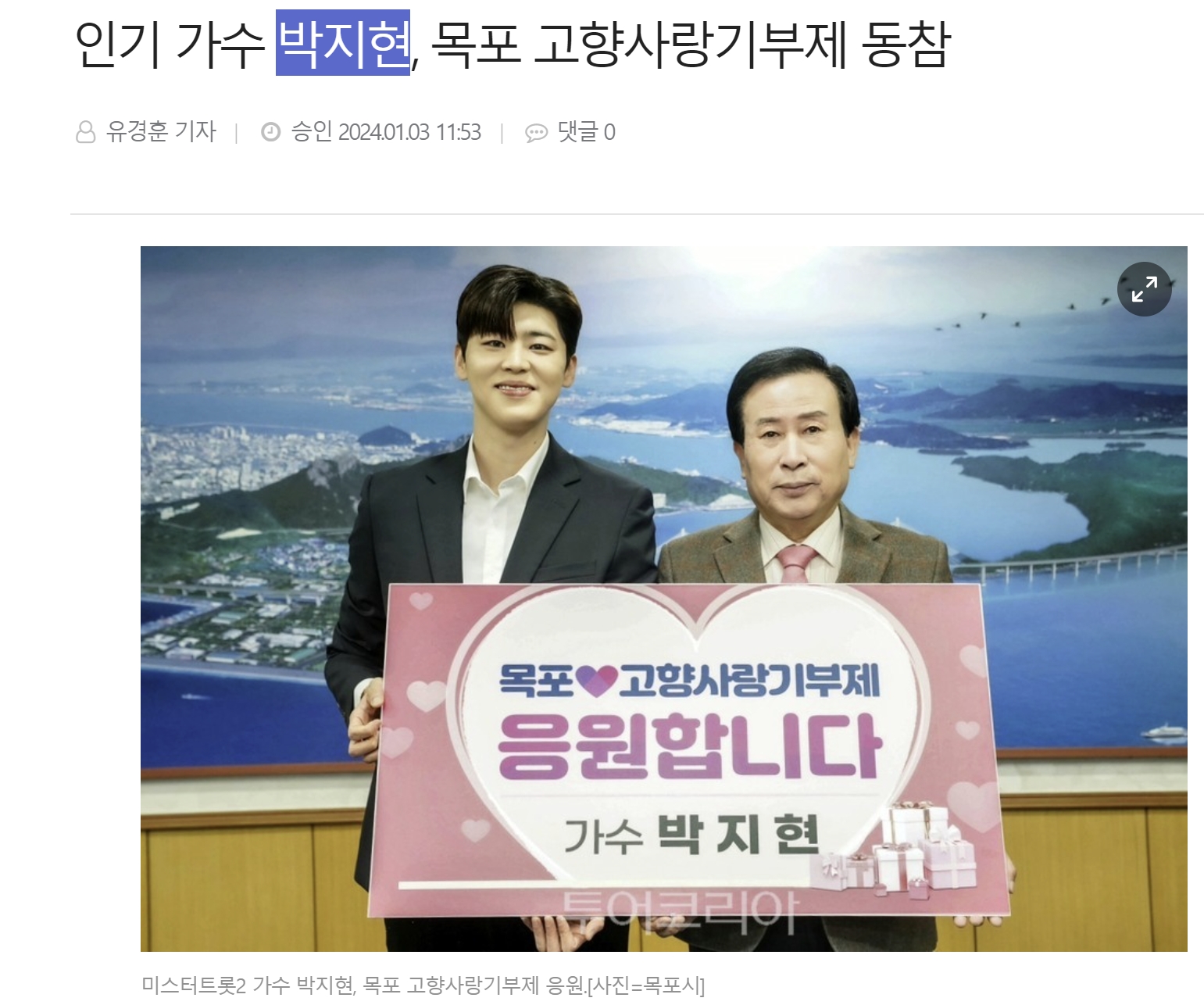지현님은 "고향 목포의 한결같은 사랑과 관심에 감사드린다며 갑진년 새해 모두 행복하시고 고향사랑기부제가 목포 발전의 밑거름이 될 수 있도록 많은 분들이 응원해주길 바란다고 전했습니다