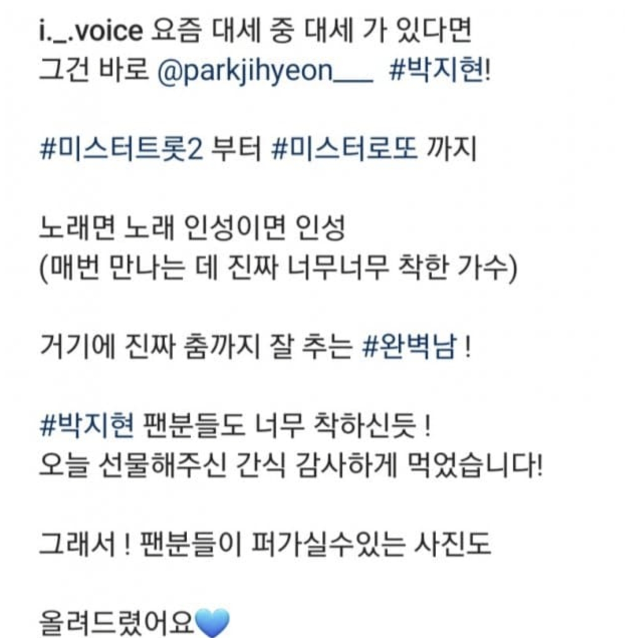 지현님의 넘 이쁘게 패딩입은 사진과 함께 "박 스타 잘생겼지~노래 잘하지~성실하지~나한테 잘하지~항상 건강 챙기고 홧팅하자 라고 게실글을 올려주셨는데요