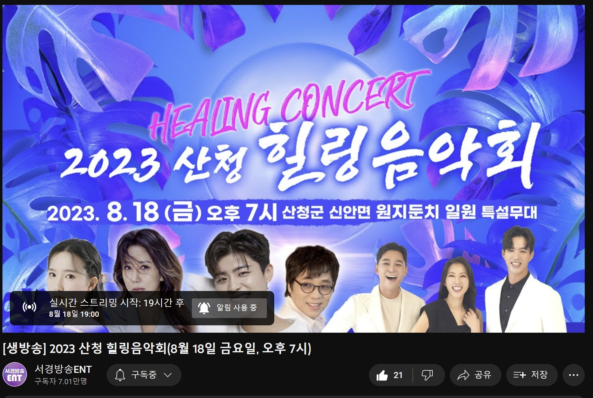 18일 오후 7시 진행되는 산청 힐링음악회는 유튜브 채널에서도 실시간으로 볼 수있습니다