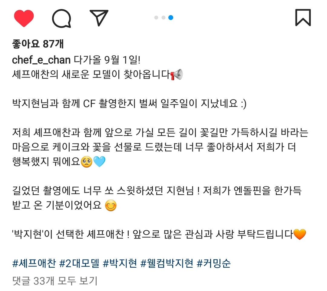 셰프애찬의 공식 인스타계정에서 2대모델 박지현 COMING SOON이란 게시물을 올려주었습니다