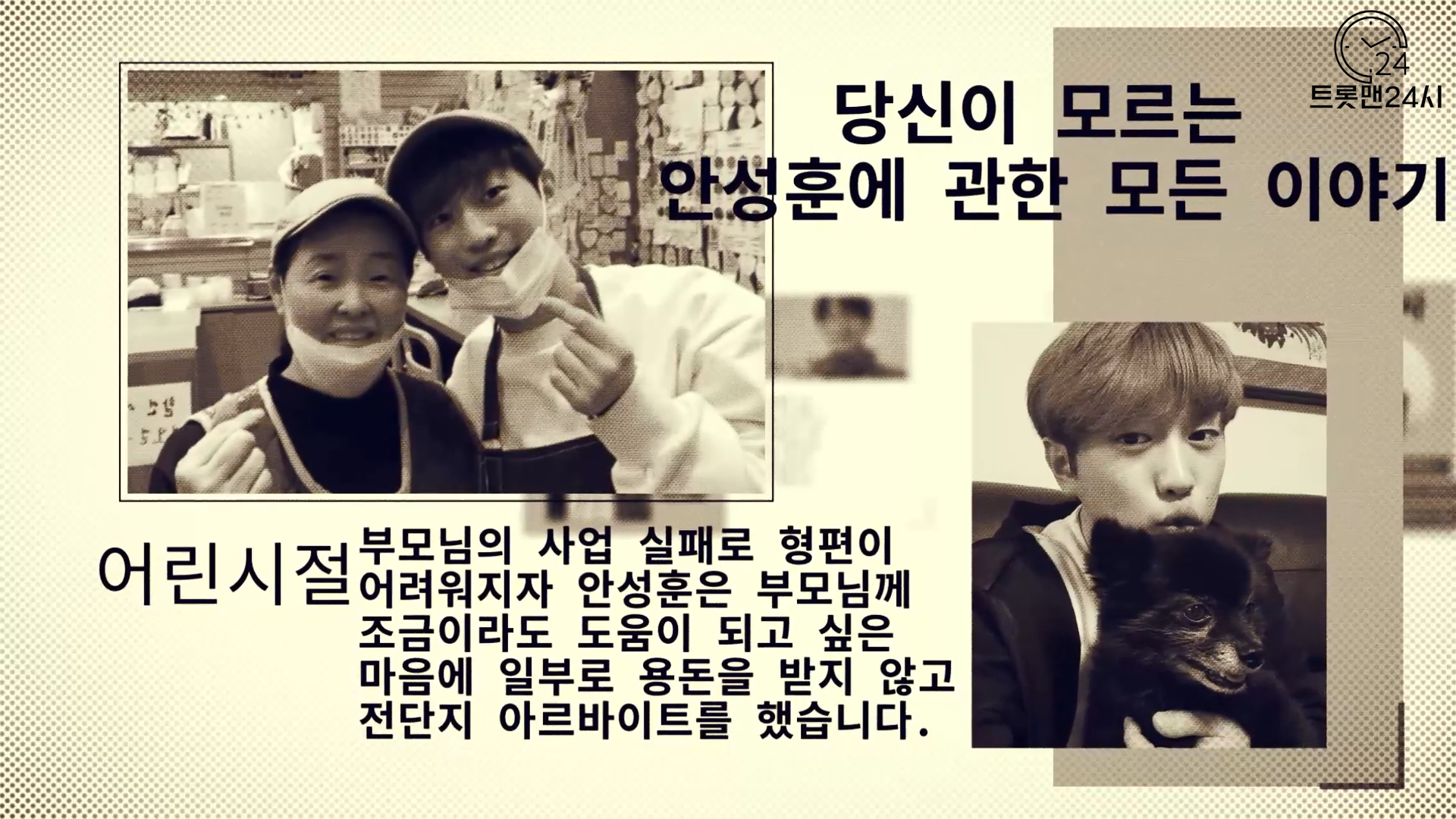 안성훈은 어린 시절 부모님의 사업 실패로 형편이 어려워지자 조금이라도 도움이 되고 싶은 마음에 일부로 용돈을 받지 않고 직접 전단지 아르바이트를 했습니다.
