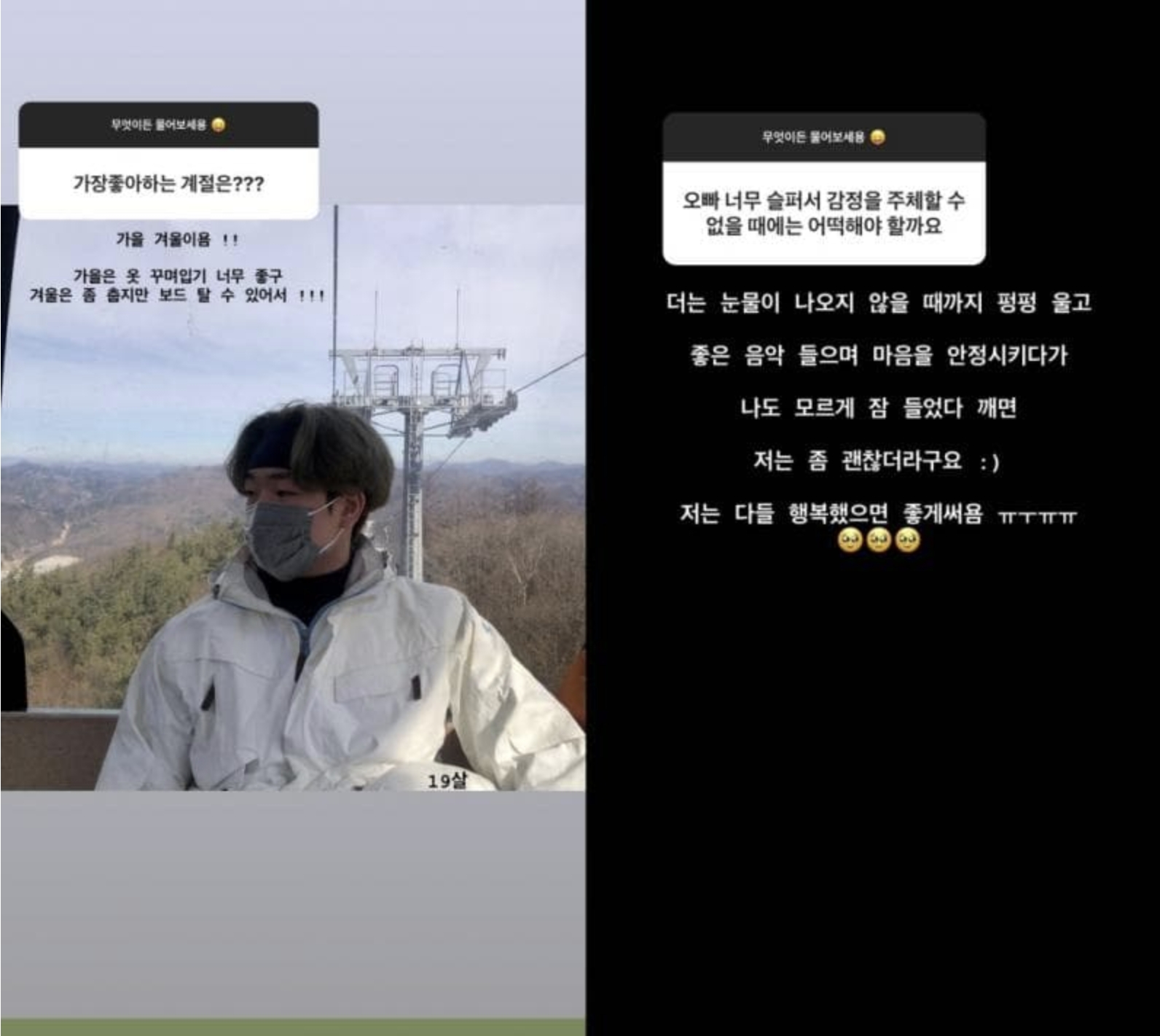 가을은 옷 꾸며입기 너무 좋고 겨울은 춥지만 보드 탈수 있어서!