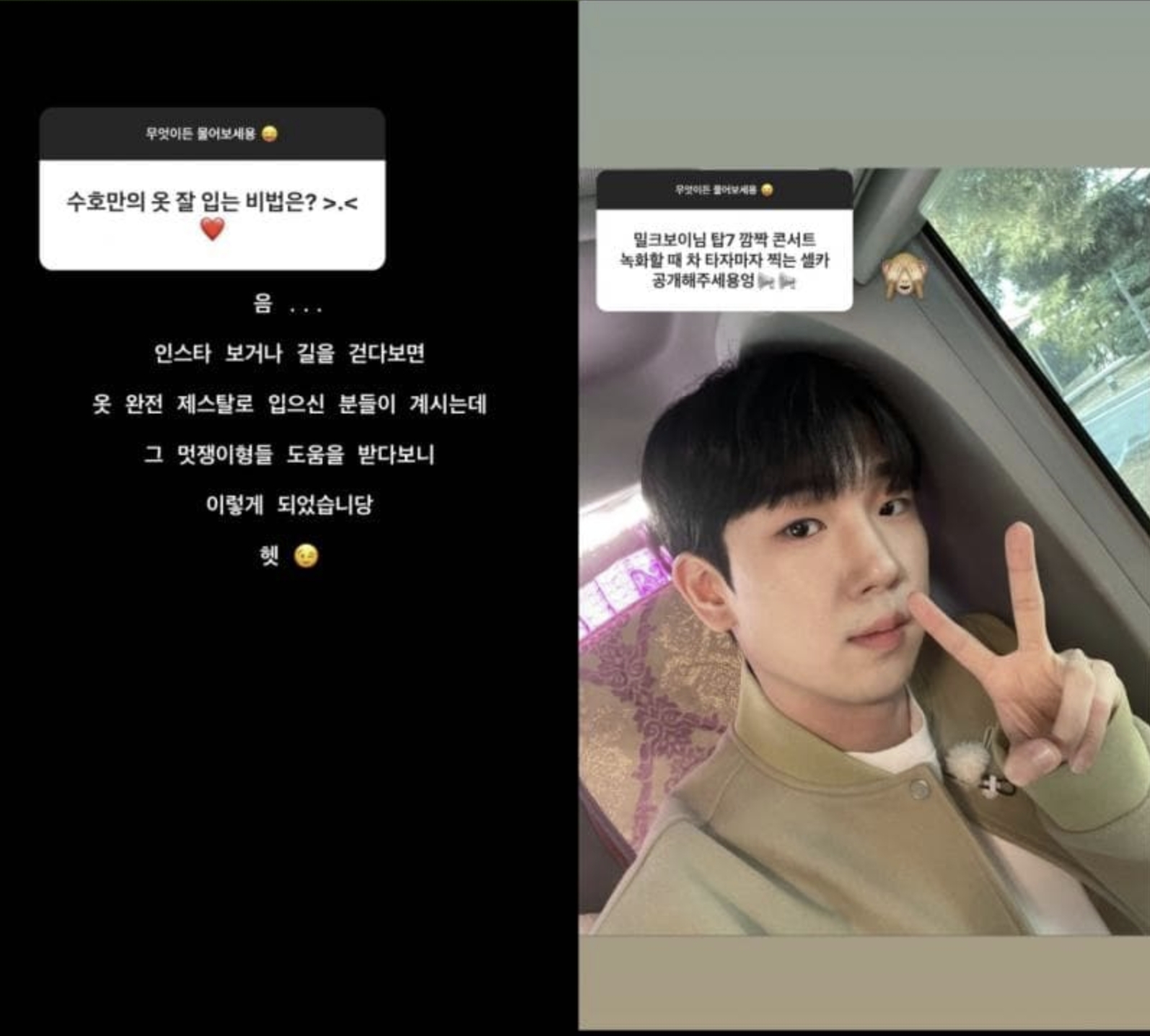 Q 밀크보이님 탑7 깜짝 콘서트 녹화할때 차 타자마자 찍는 셀카 공개해주세요!