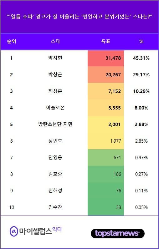 마이셀럽스 스타 익디투표인 '일룸 소파'광고가 잘 어울리는 편안하고 분위기 있는 스타는?이란 조사에서 45%가 넘는 득표율로 박지현이 1위를 차지했습니다