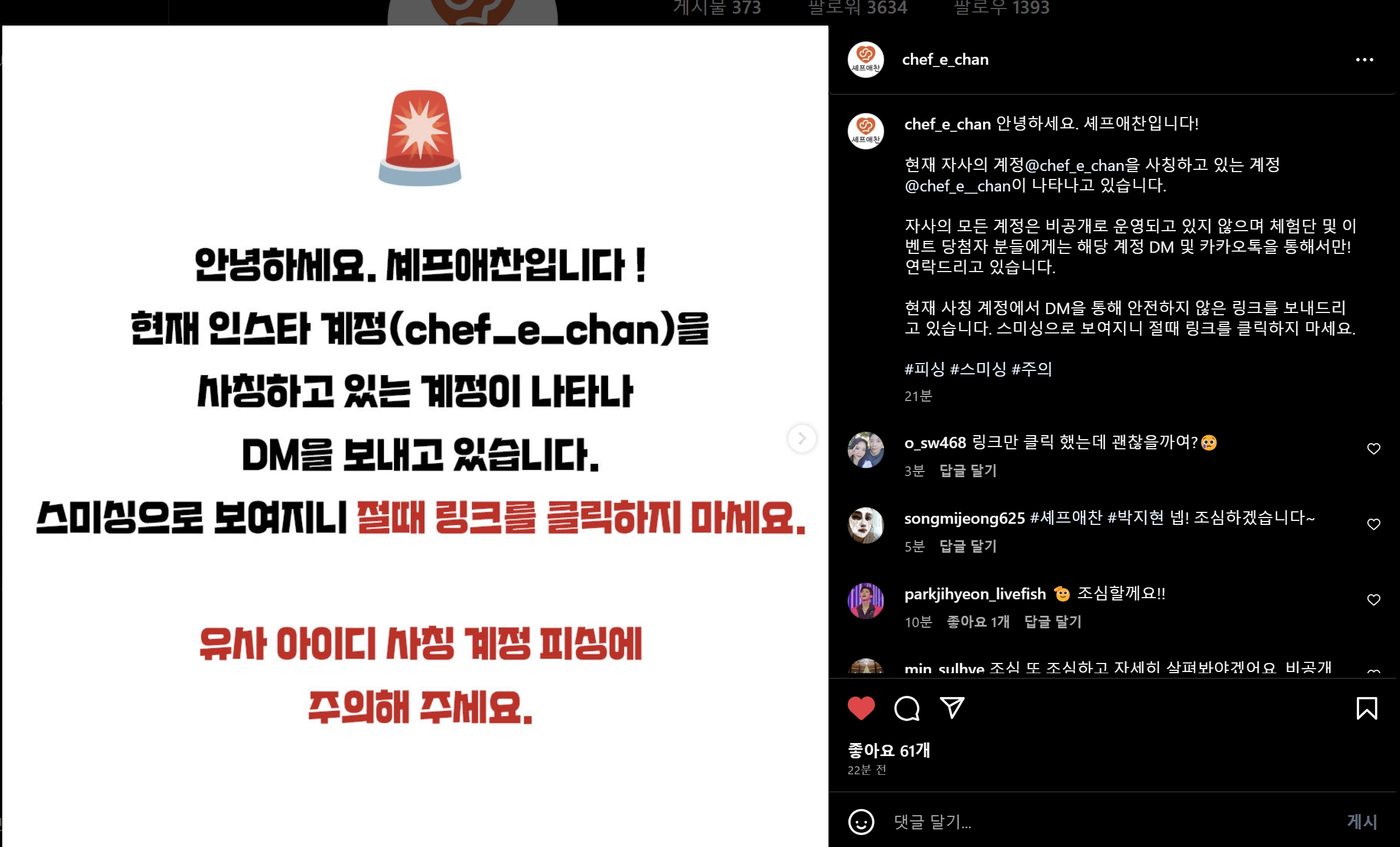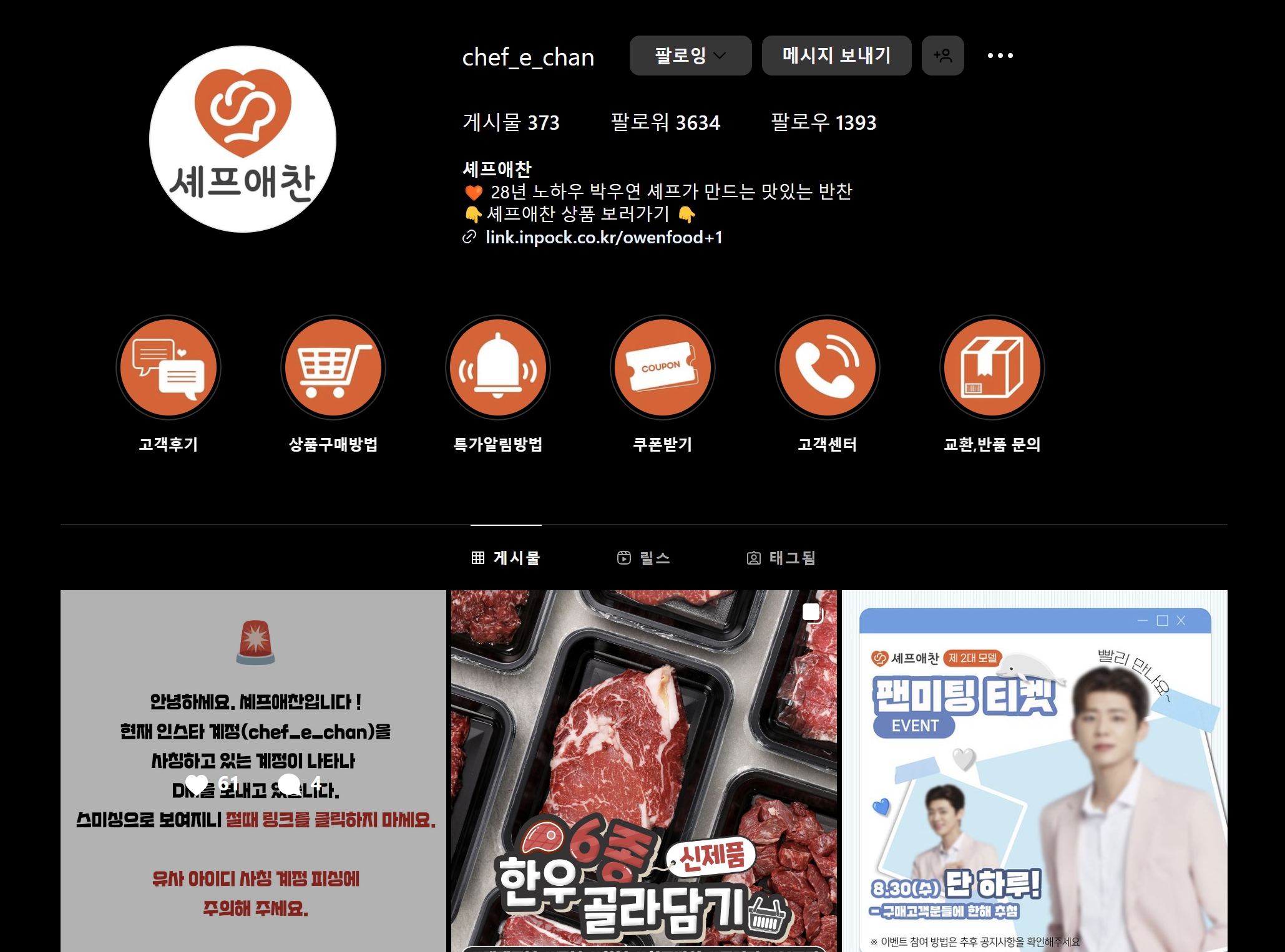 셰프애찬 사칭 사기계정이 생겨서 조심해야 할 것 같습니다!