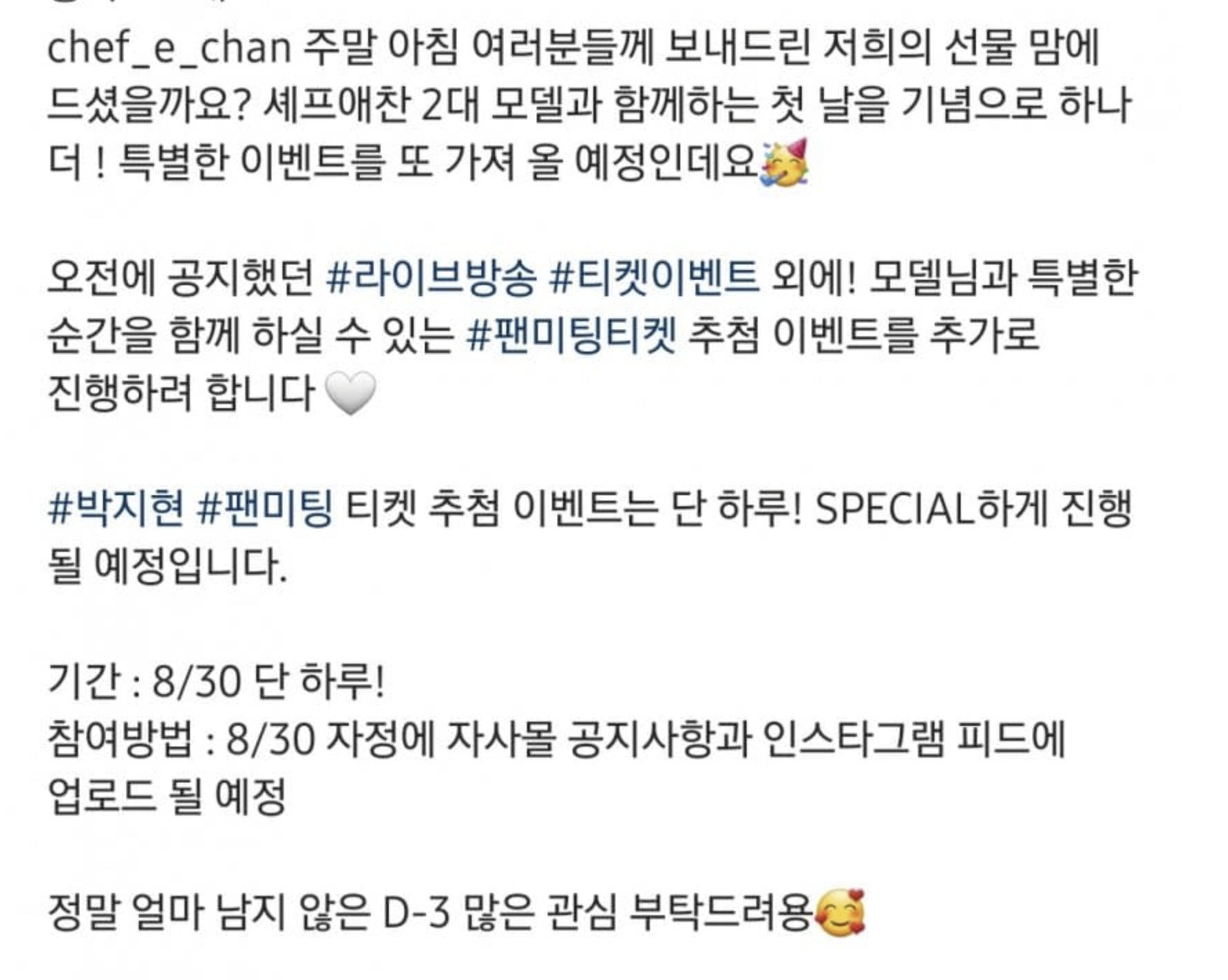 셰프애찬 공식 계정에서 셰프애찬 2대 모델 공개기념 라이브 방송 방청권 이벤트를 실시한다고 밝혔습니다 박지현과 직접 소통하고 만나볼 수 있는 라이브 방송 티켓 이벤트로 8월30일부터 총 6일간 자사몰 및 스마트스토어 구매 고객분들을 기준으로 추첨될 예정이라고 전했습니다