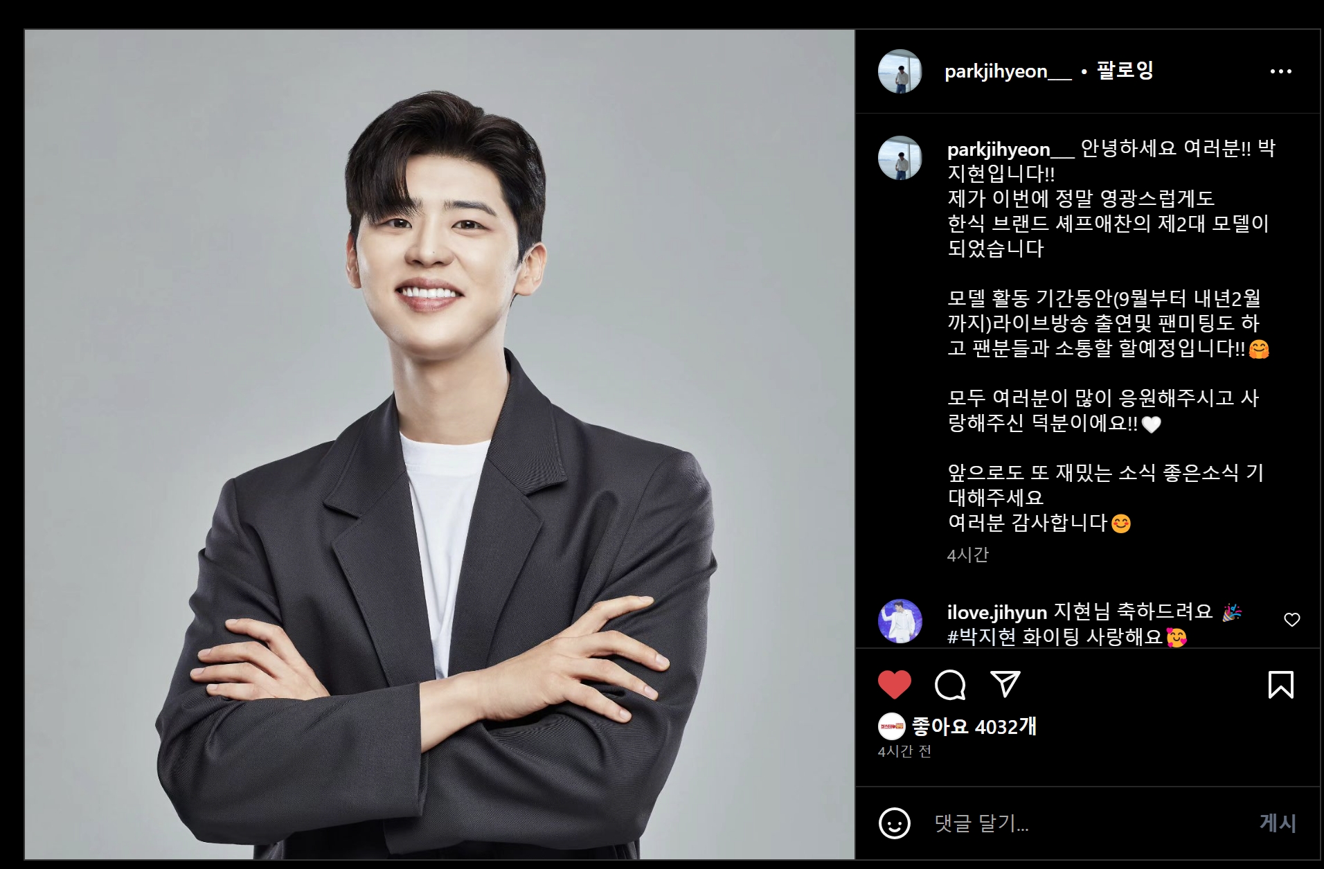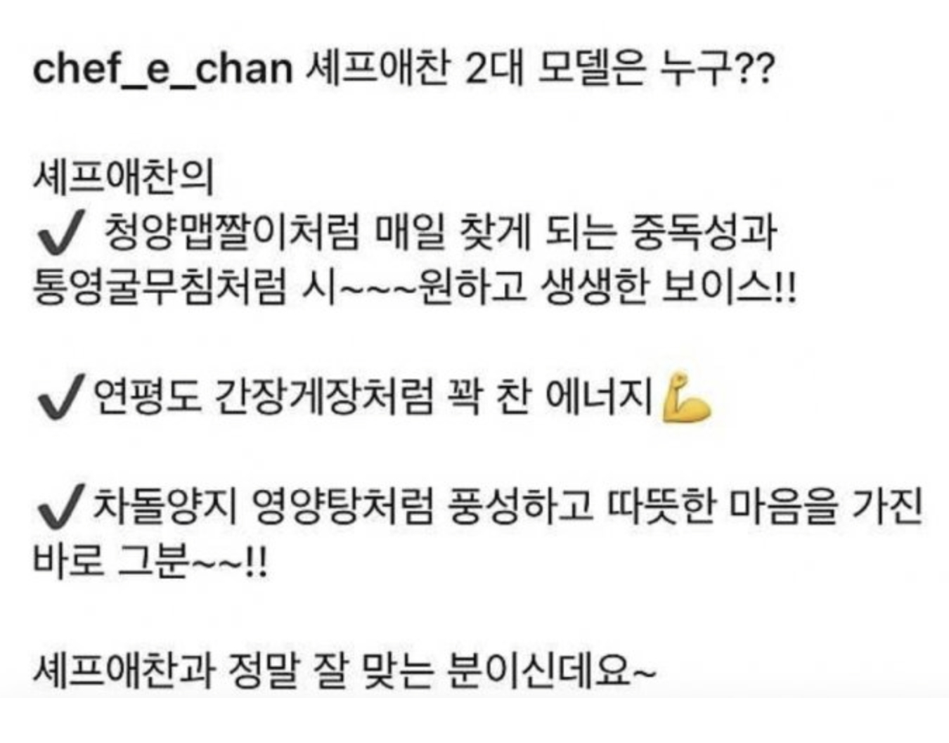 제가 8일 밤에 위에 셰프애찬에서 공개한 자료를 바탕으로 박지현이라고 확신해서 영상을 만들고 있었는데 9일 아침에 박지현이 인스타에 직접 셰프애찬 cf를 찍게되었다고 글을 남겨주었습니다