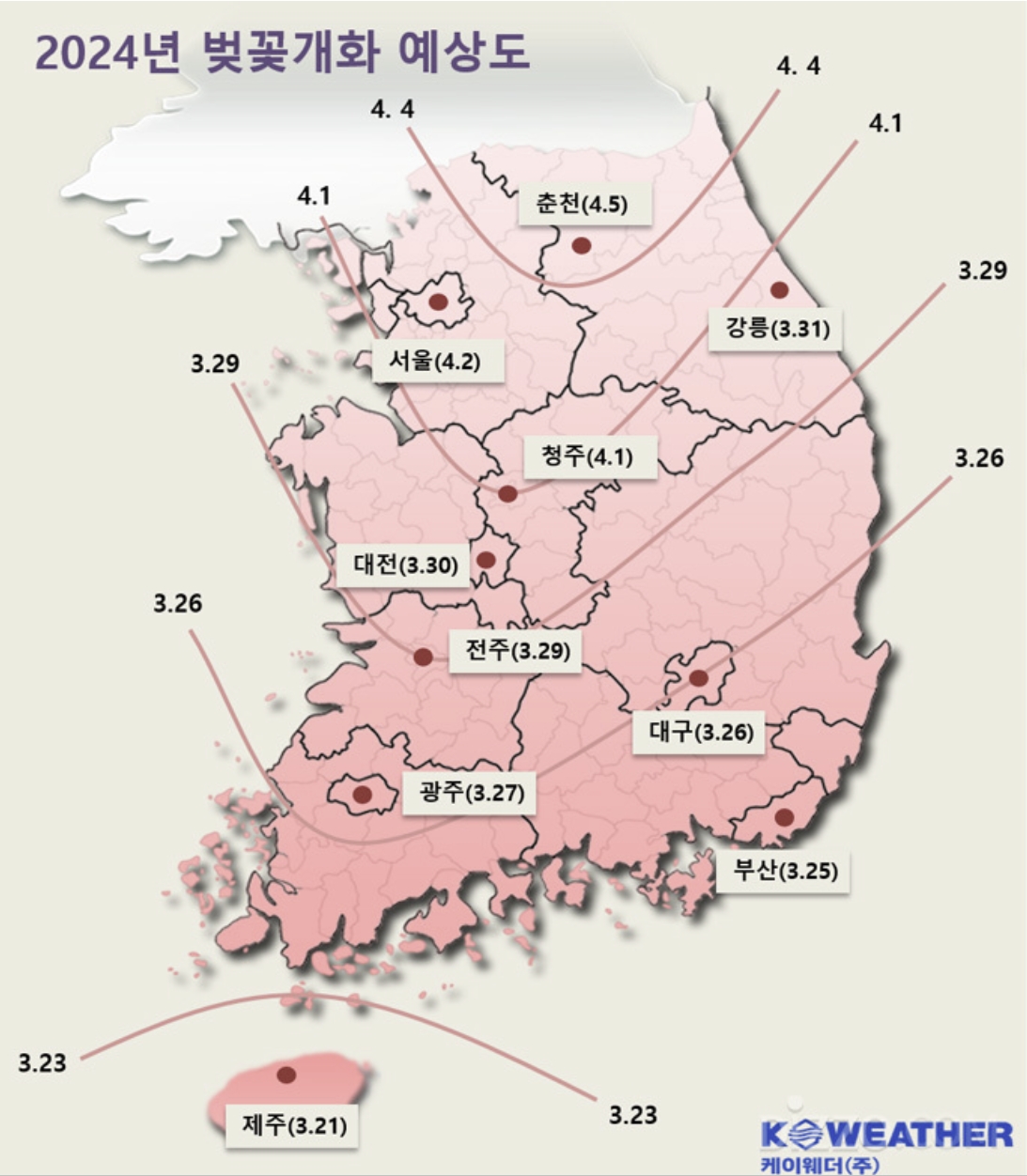 2024년 벚꽃 개화 예상도 지도를 보면 알수 있듯이 제주도는 3월21일에 벚꽃이 필 것으로 예상되고 있는데요